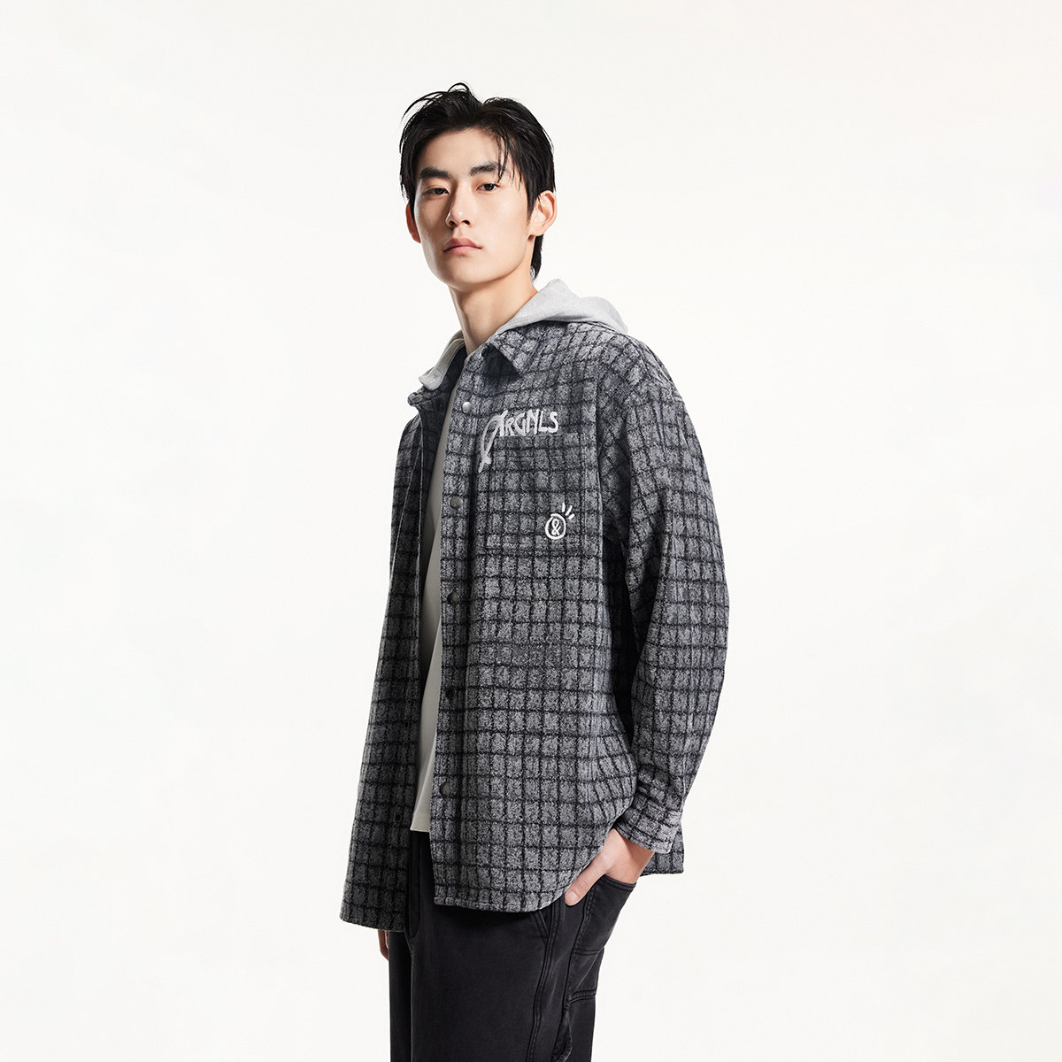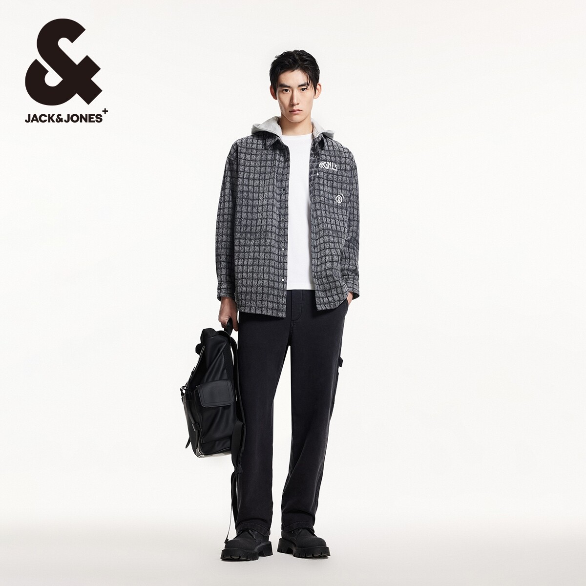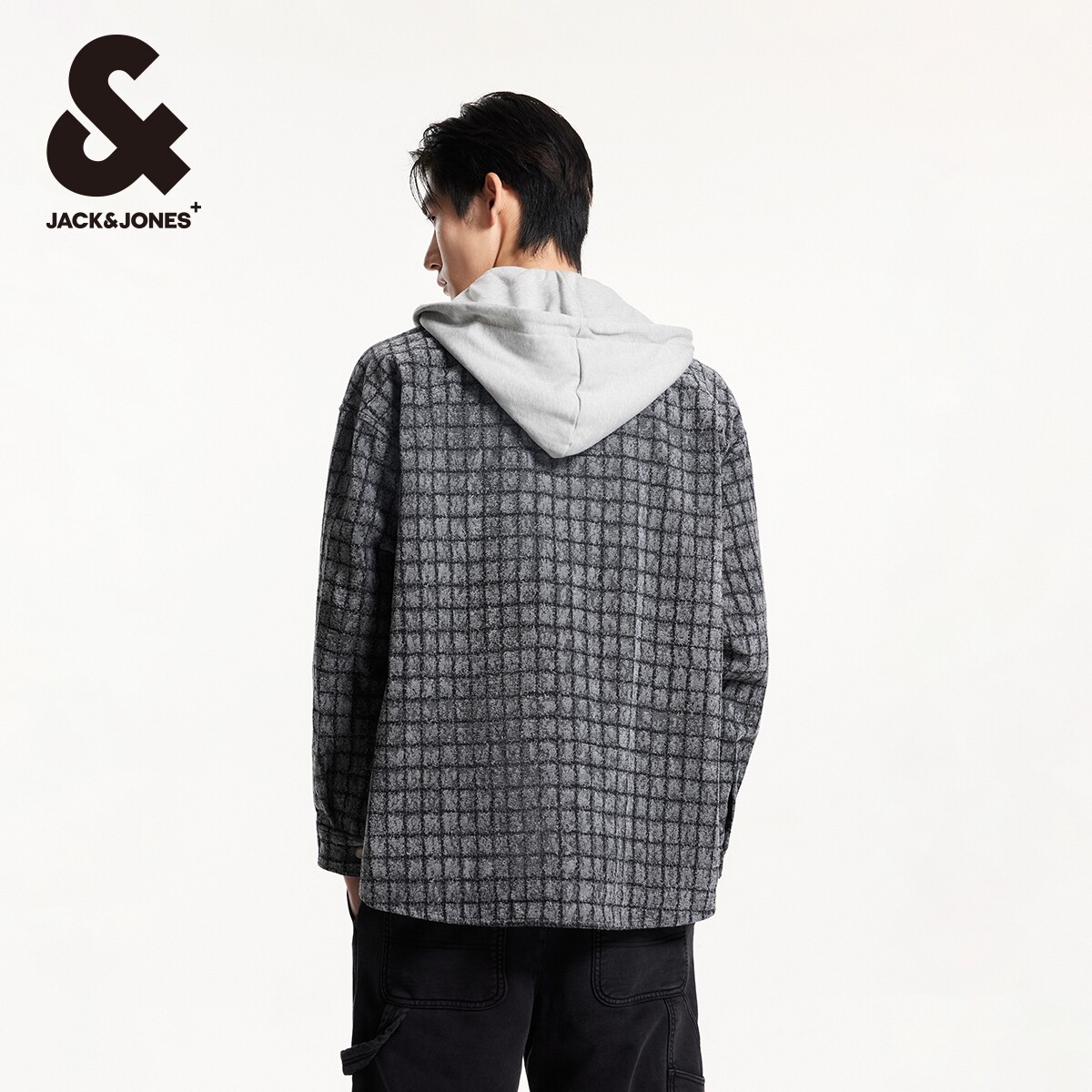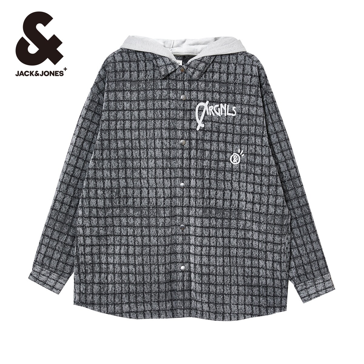 杰克琼斯春季舒适时尚潮流百搭连帽长袖上衣小格纹衬衫外套男装士