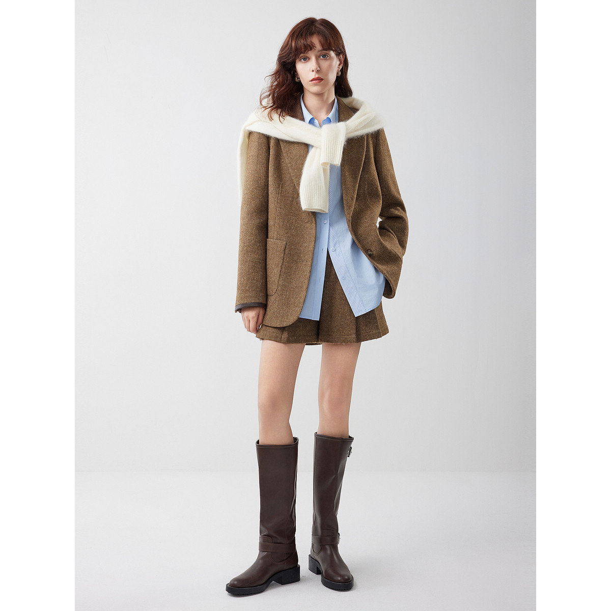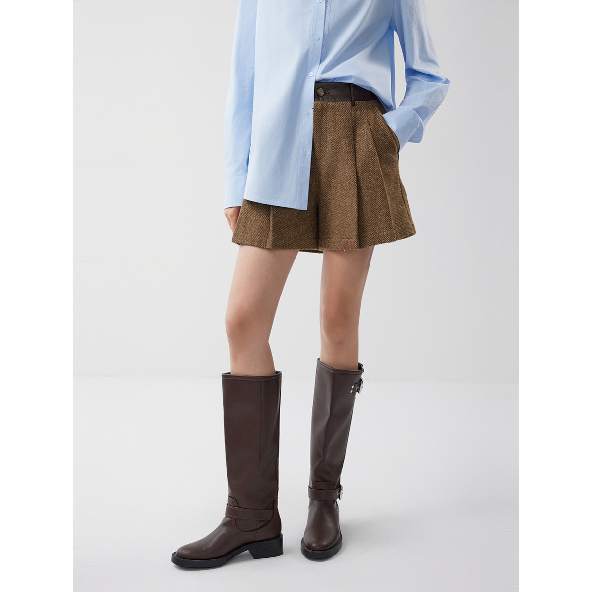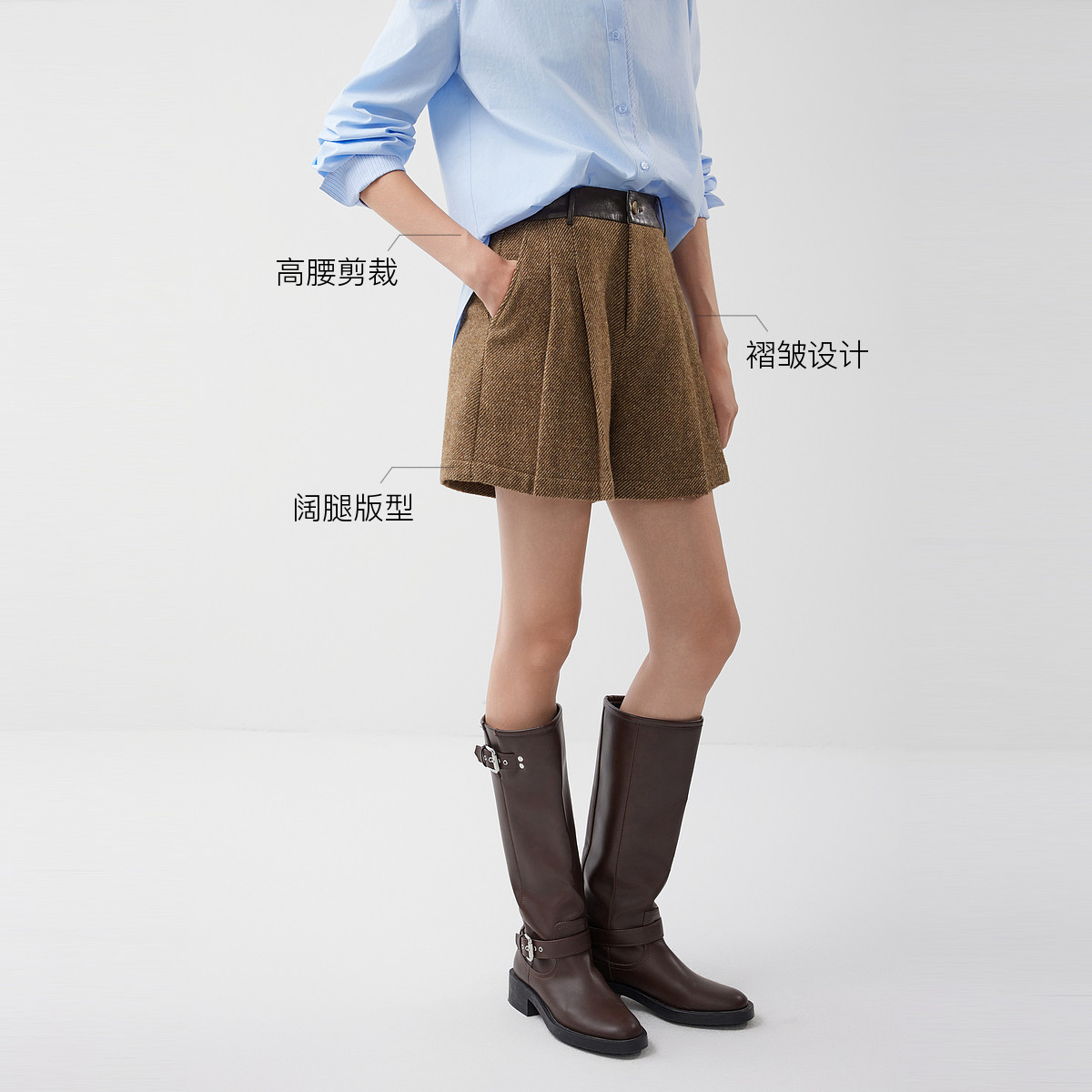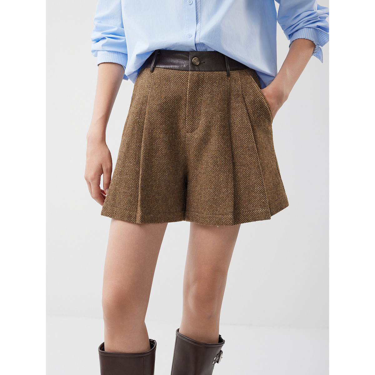 ELLE绵羊毛高级感毛呢休闲短裤女2025冬季新款拼接小个子阔腿裤子