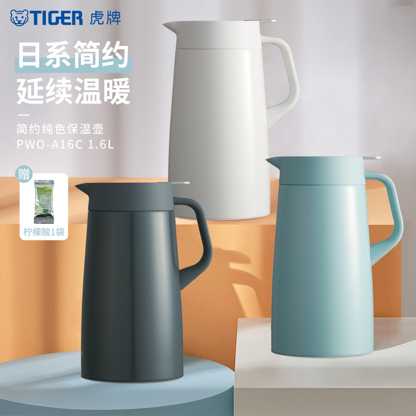 tiger虎牌PWO-A16C不锈钢保温壶家用简约纯色便携保暖热水壶1.6L