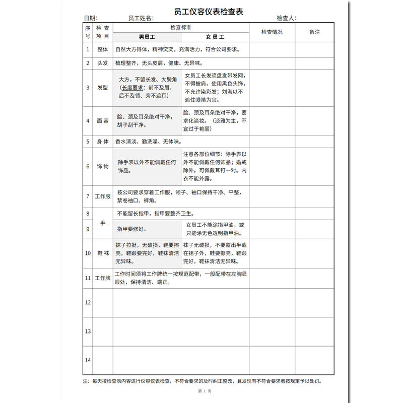 员工仪容仪表检查记录公司单位职员外表衣着服装整洁统一标准登记