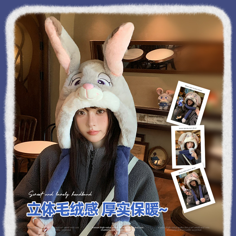 围巾帽子手套一体女连帽冬季帽可爱保暖围脖毛绒冬天三件套厚防寒