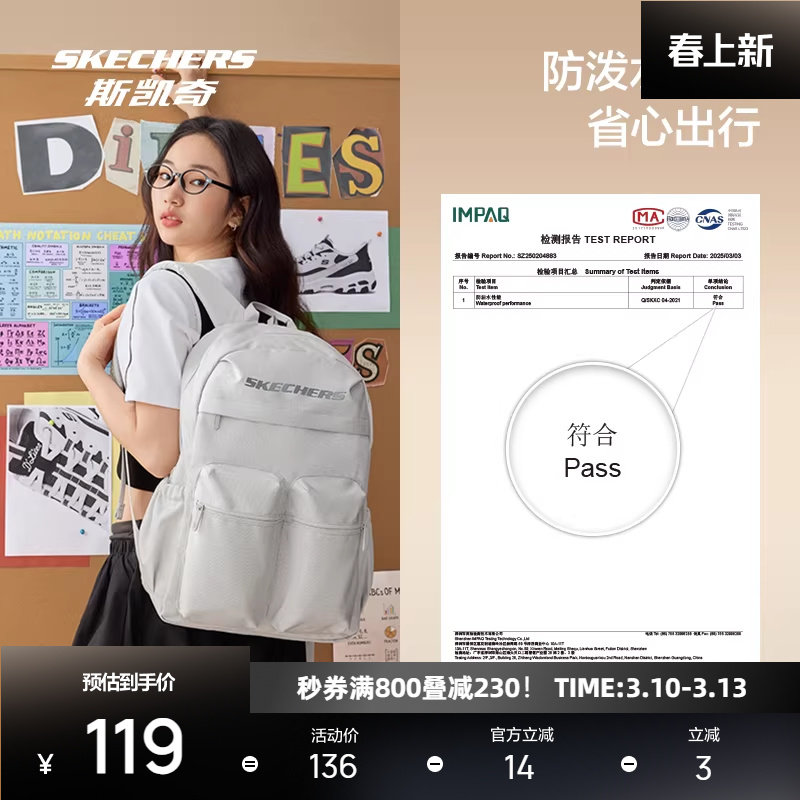 斯凯奇新品双肩包背包防泼水大容量口袋书包旅游通勤轻便登山包
