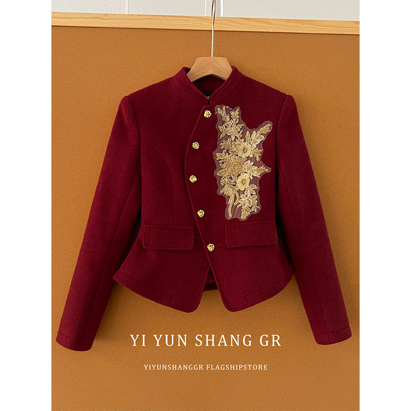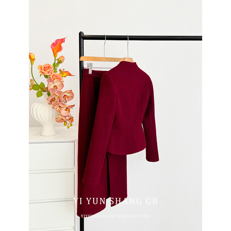 红色复古小香风套装女秋冬新款重工钉珠短外套+显瘦半身裙两件套