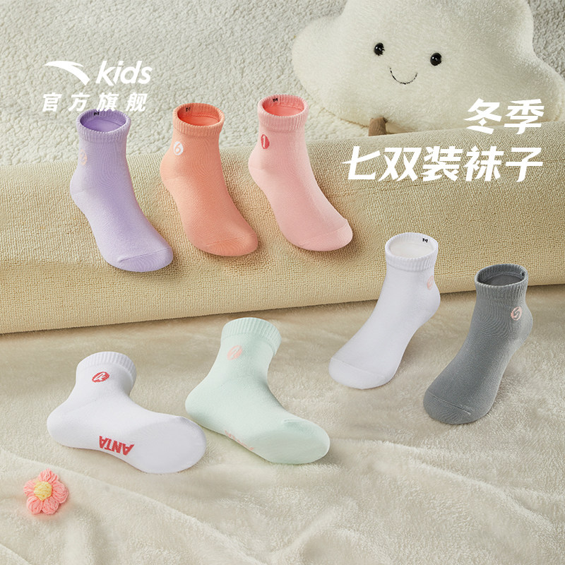 安踏儿童袜子秋冬2025新精梳棉七双装短袜子男童运动跑步袜子女童
