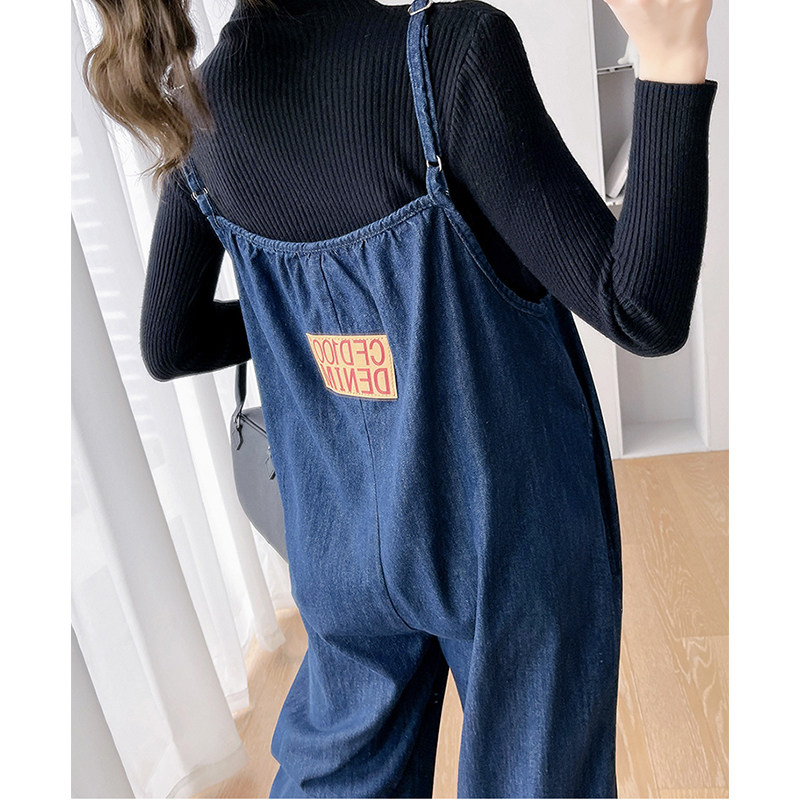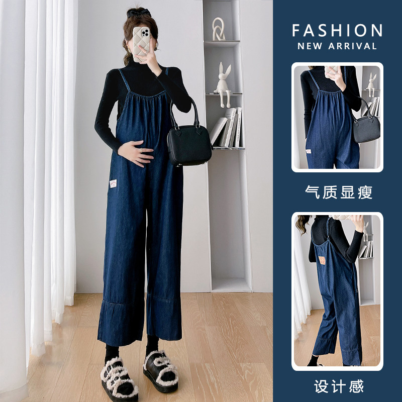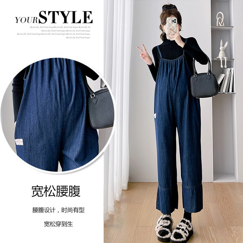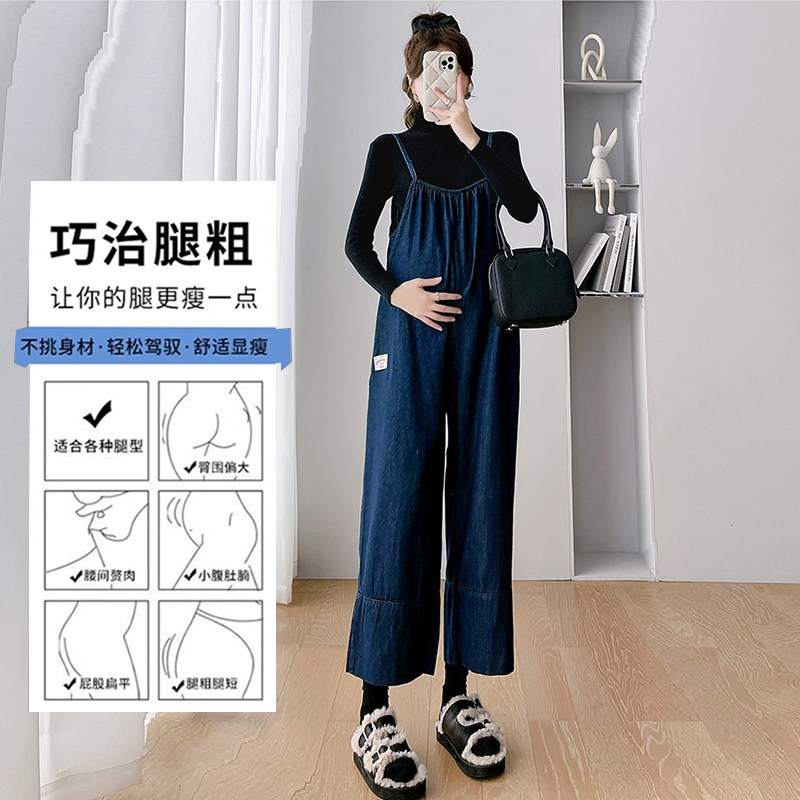 婧麒孕妇牛仔背带裤秋冬外穿2024新款韩版两面穿连体阔腿裤孕妇装