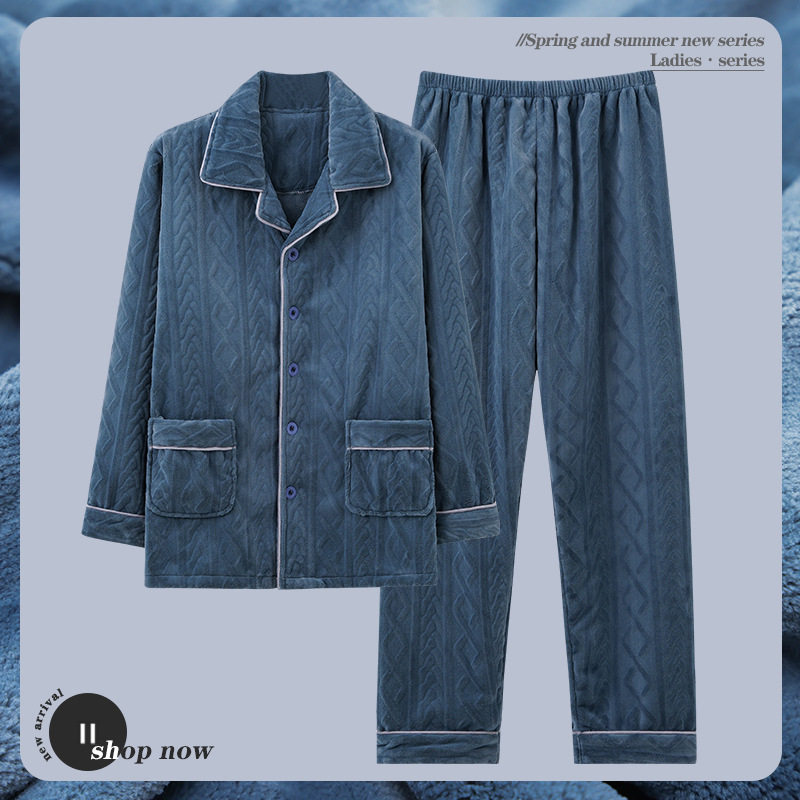 秋冬季珊瑚绒加厚加绒款三层夹棉袄男士睡衣保暖家居服套装可外穿