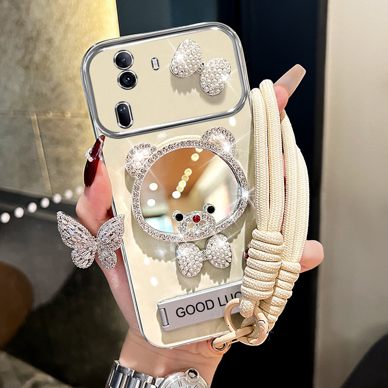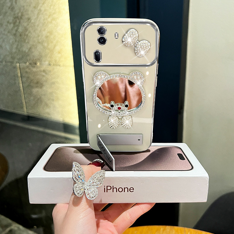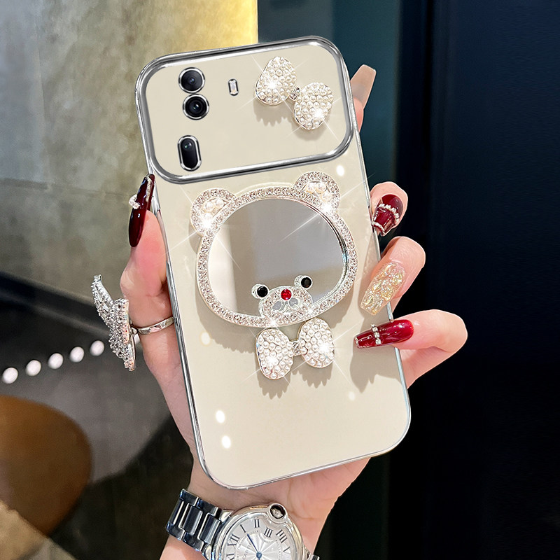 适用opporeno11手机壳reno11pro领结熊补妆镜大视窗创意全包电镀防摔壳