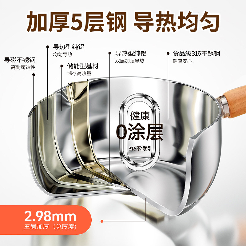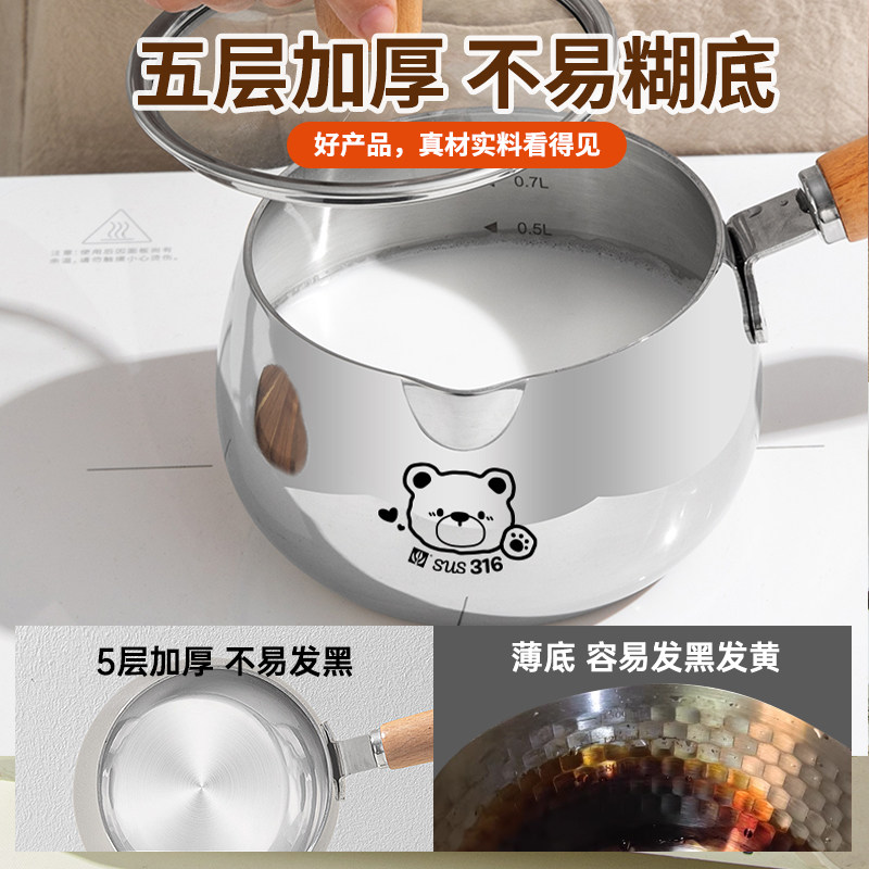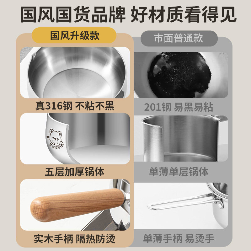 一人食锅小熊胡桃木无涂层辅食锅316L不锈钢燃气灶适用不沾小奶锅