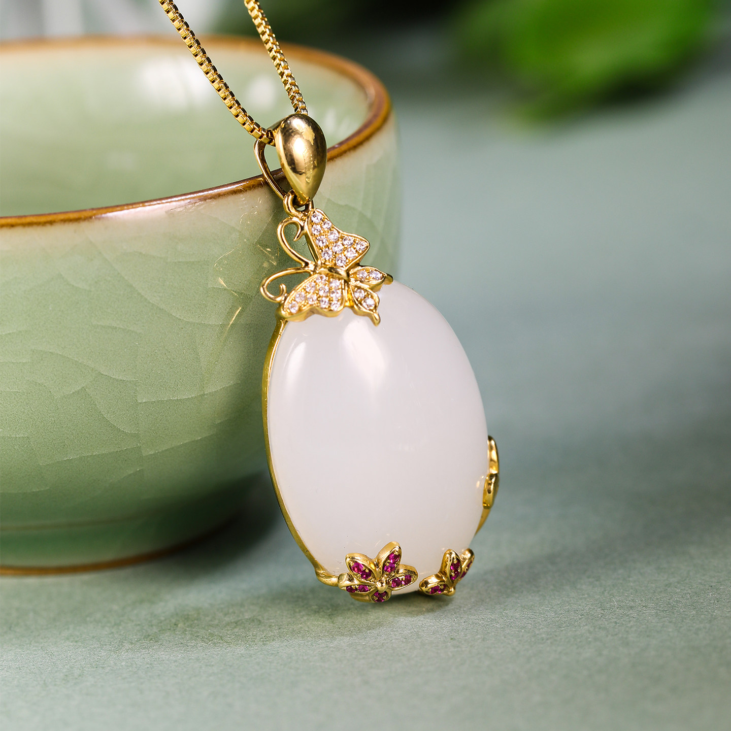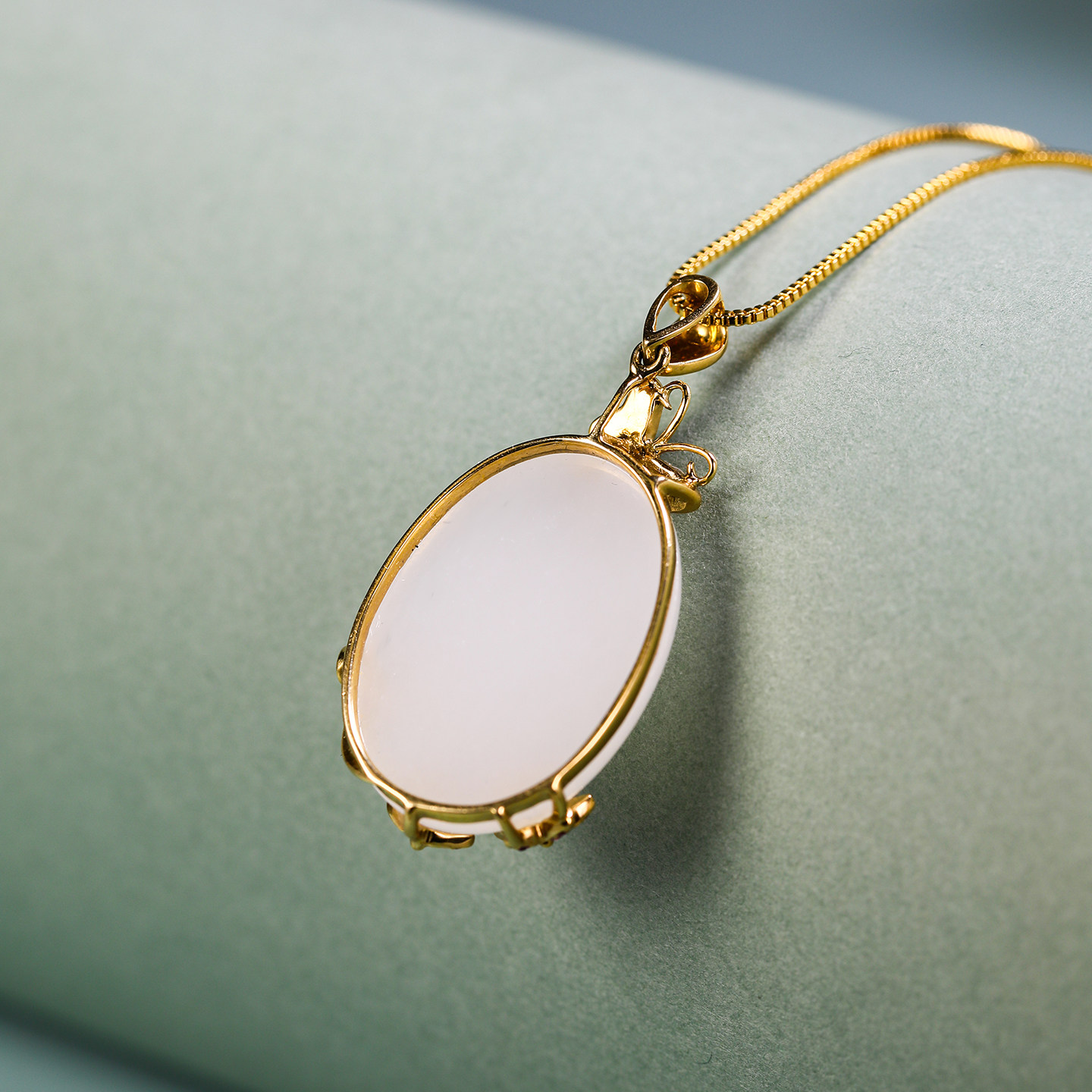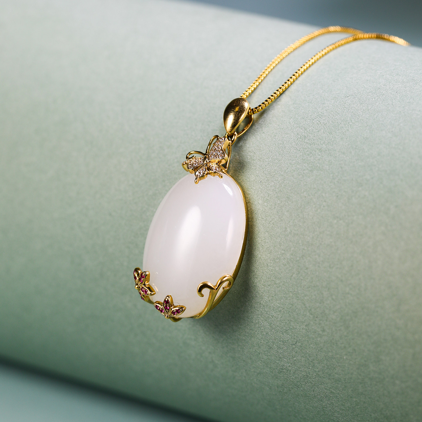 和合玉器和田玉羊脂白玉18k金镶玉钻蛋面项链玉石挂件吊坠山料女