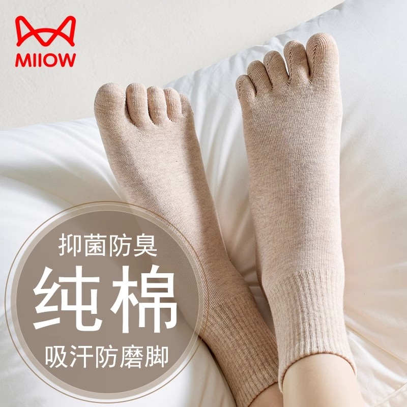 猫人五指袜子女纯棉中筒袜防臭吸汗抗菌无骨运动风分趾长筒袜
