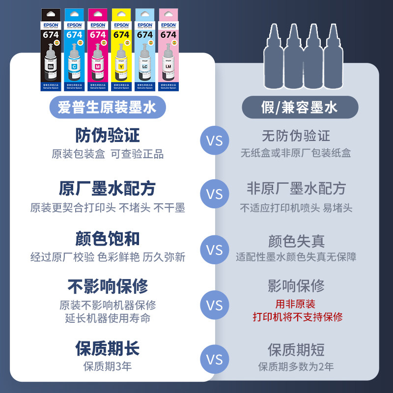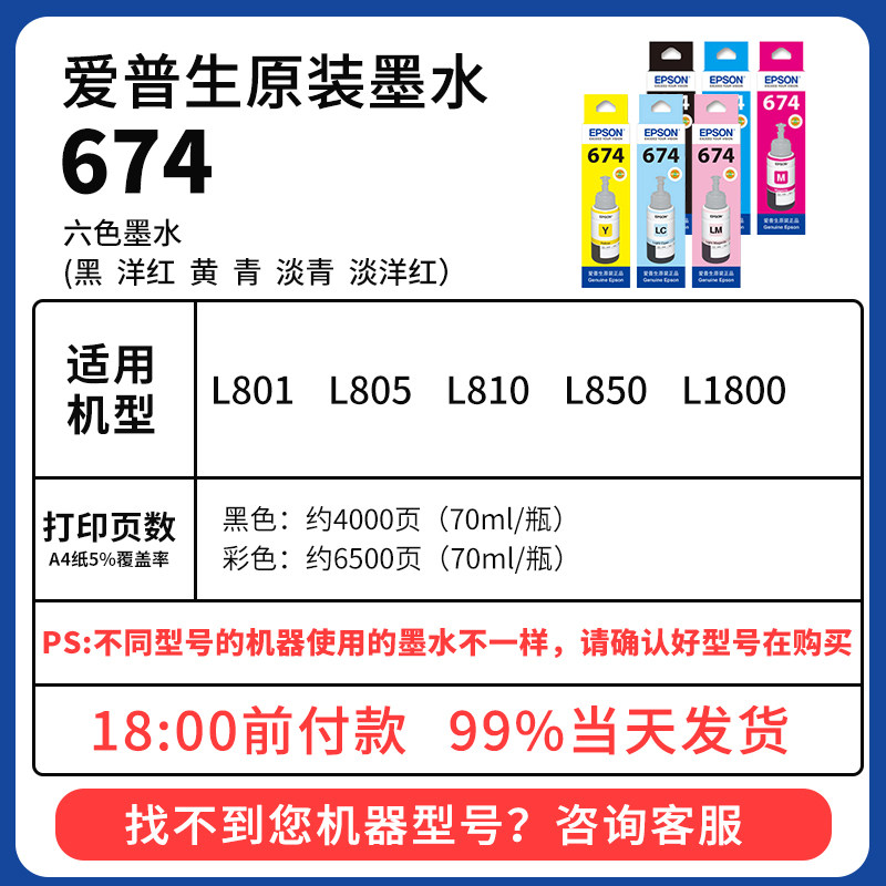 Epson爱普生T674原装墨水 L805 L801 L810 L850 L1800六色连供喷墨爱普生打印机墨水原装正品墨汁墨仓式6色