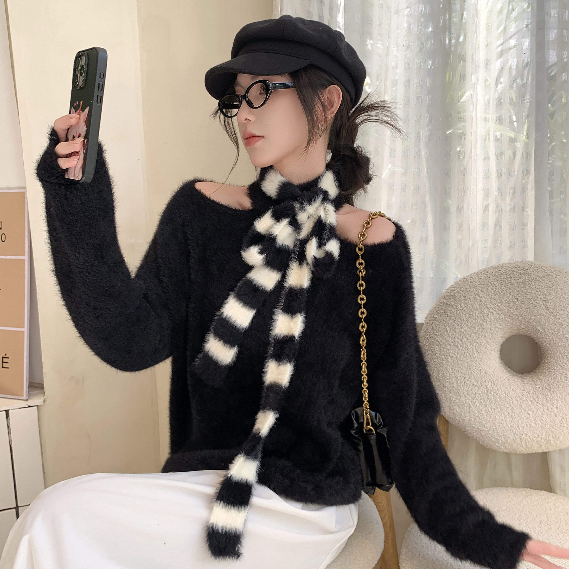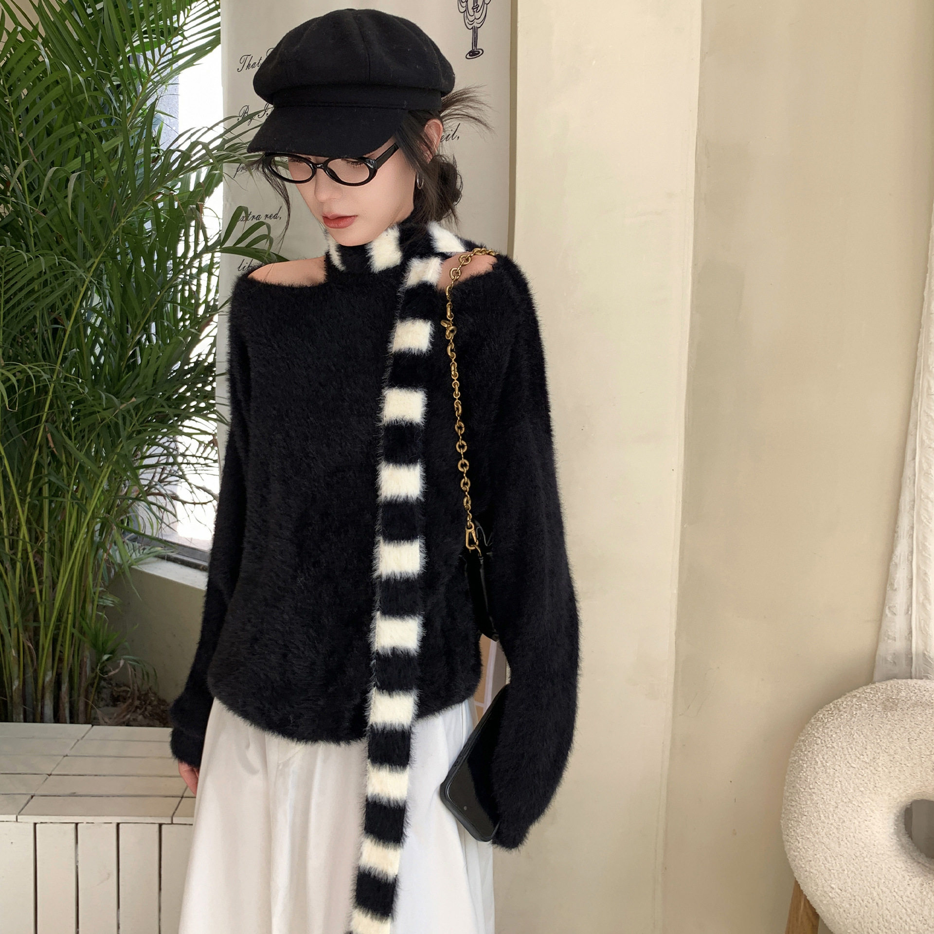 韩版秋冬新款细窄长条围巾女仿貂毛小众设计条纹针织毛绒围脖装饰