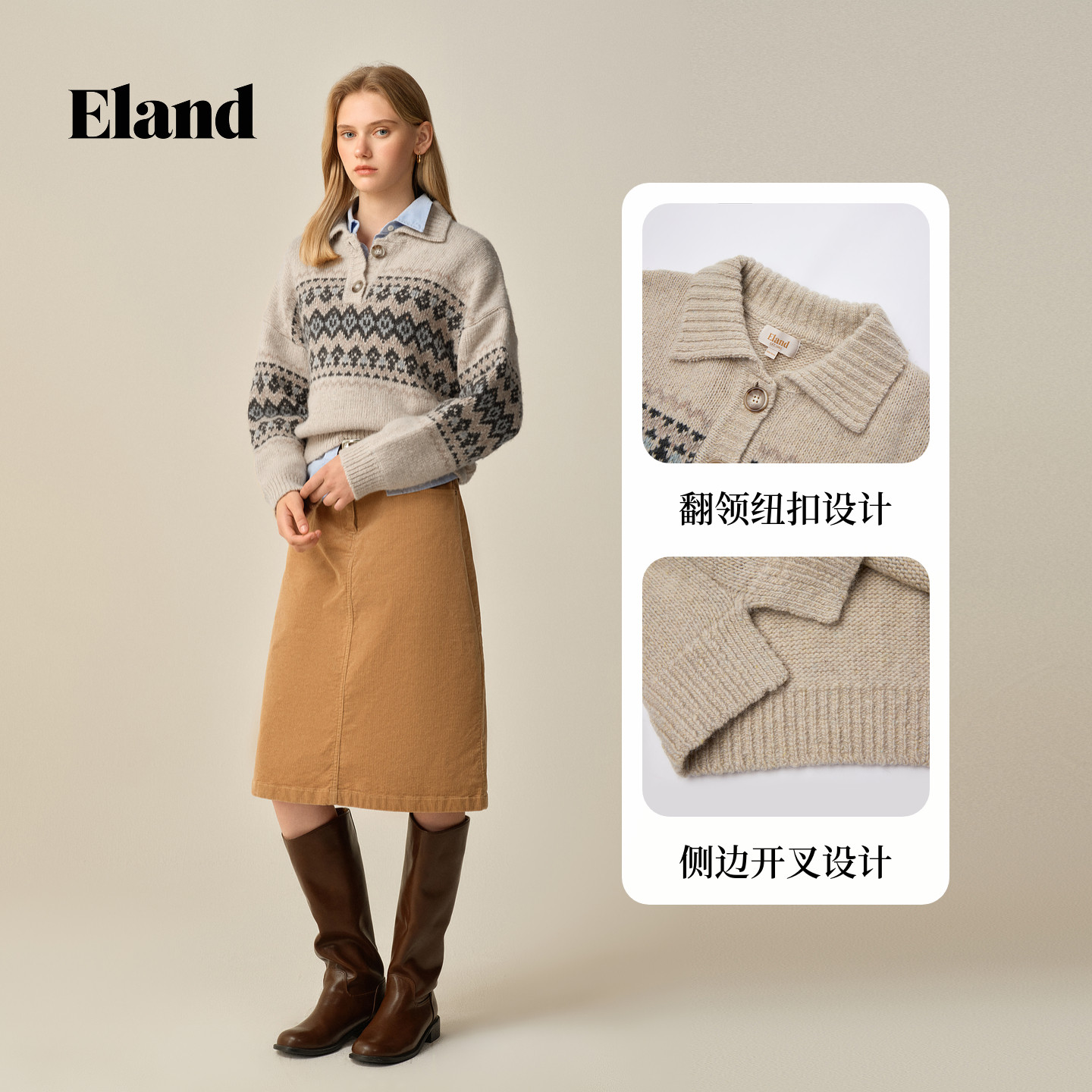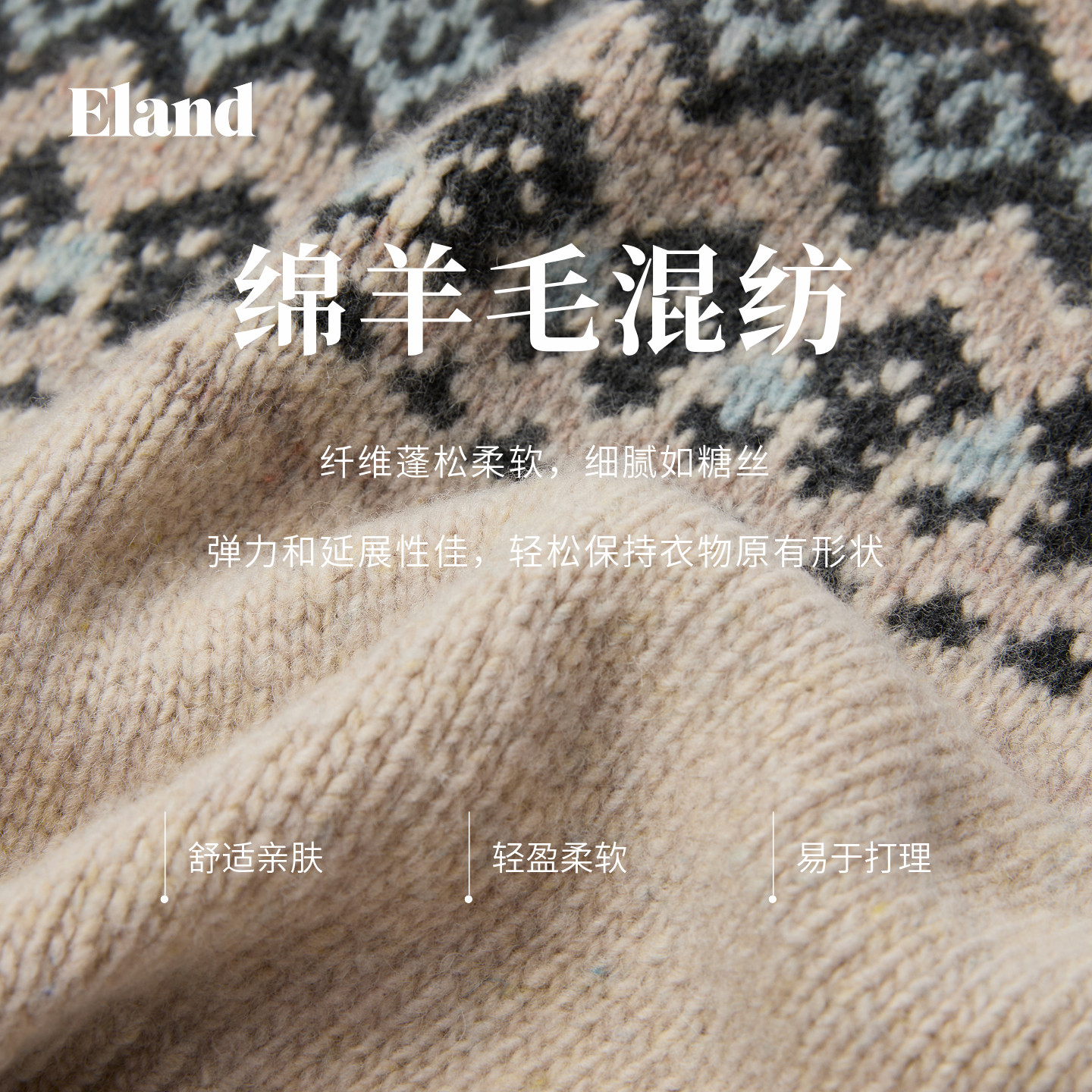 【绵羊毛】Eland衣恋毛衣女时尚翻领提花费尔岛针织衫2025冬新款