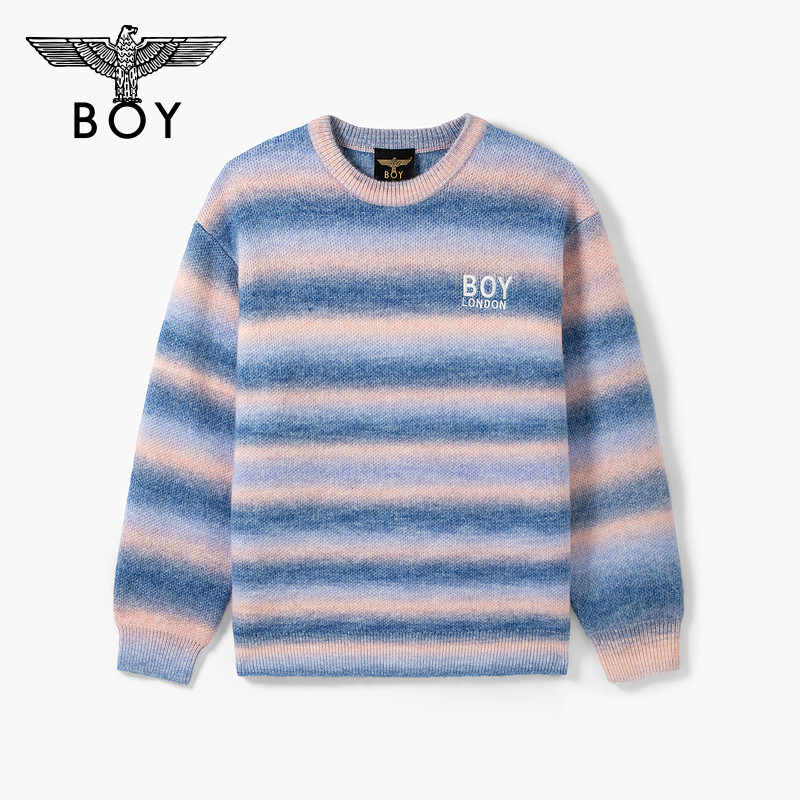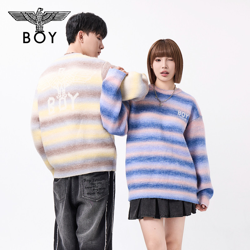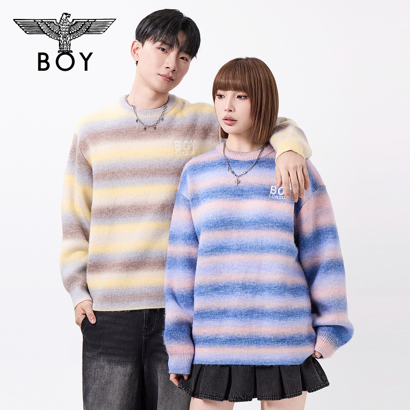 BOYLONDON春季条纹撞色学院潮牌男女同款圆领套头针织毛衣N60900