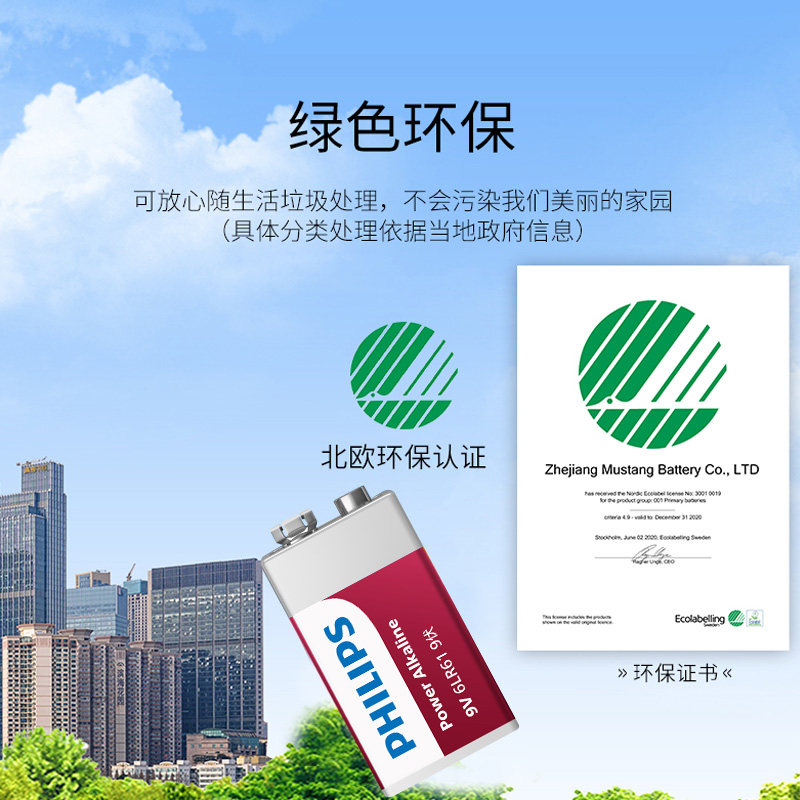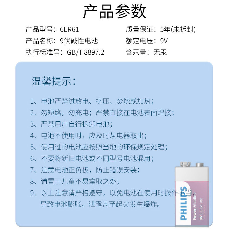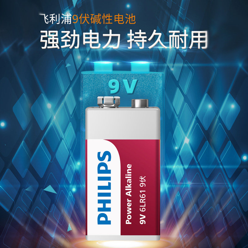 飞利浦正品9v碱性电池2粒1粒方形方块万表通用烟雾报警器体温枪九伏6lr61万用表红外线测温仪专用仪器遥控器