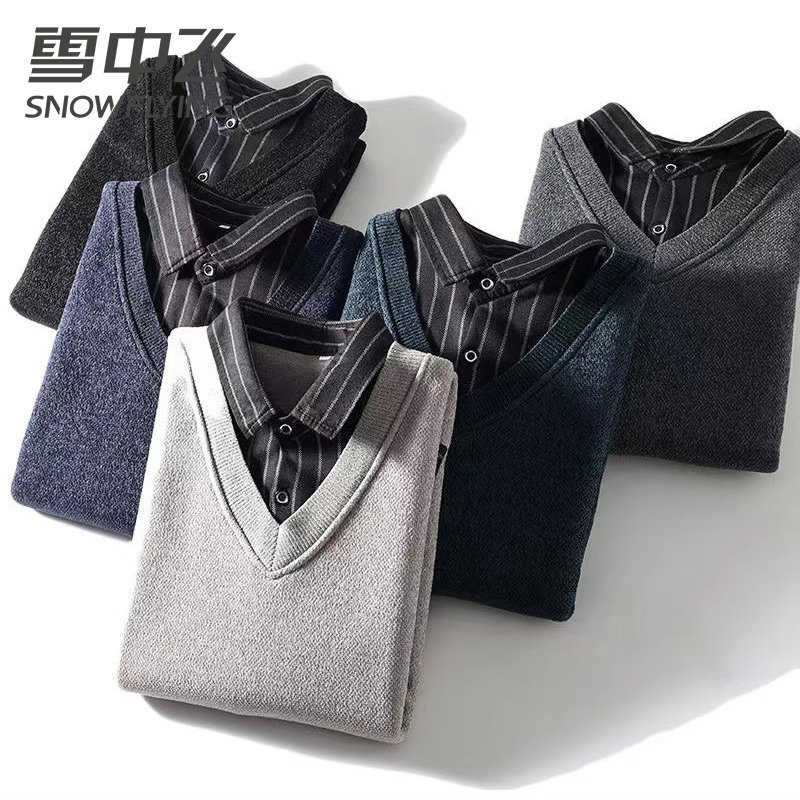 雪中飞男士保暖衬衫加绒加厚假两件中年爸爸装雪尼尔防寒保暖毛衣