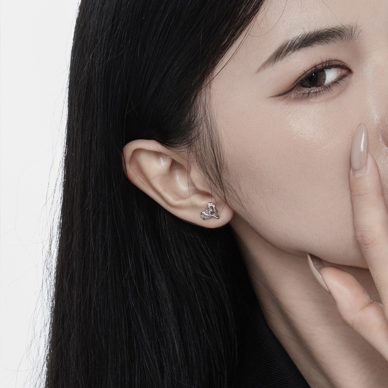 E1247 樱花粉甜心系列不对称耳钉女S925纯银纹理甜酷爱心耳饰批发