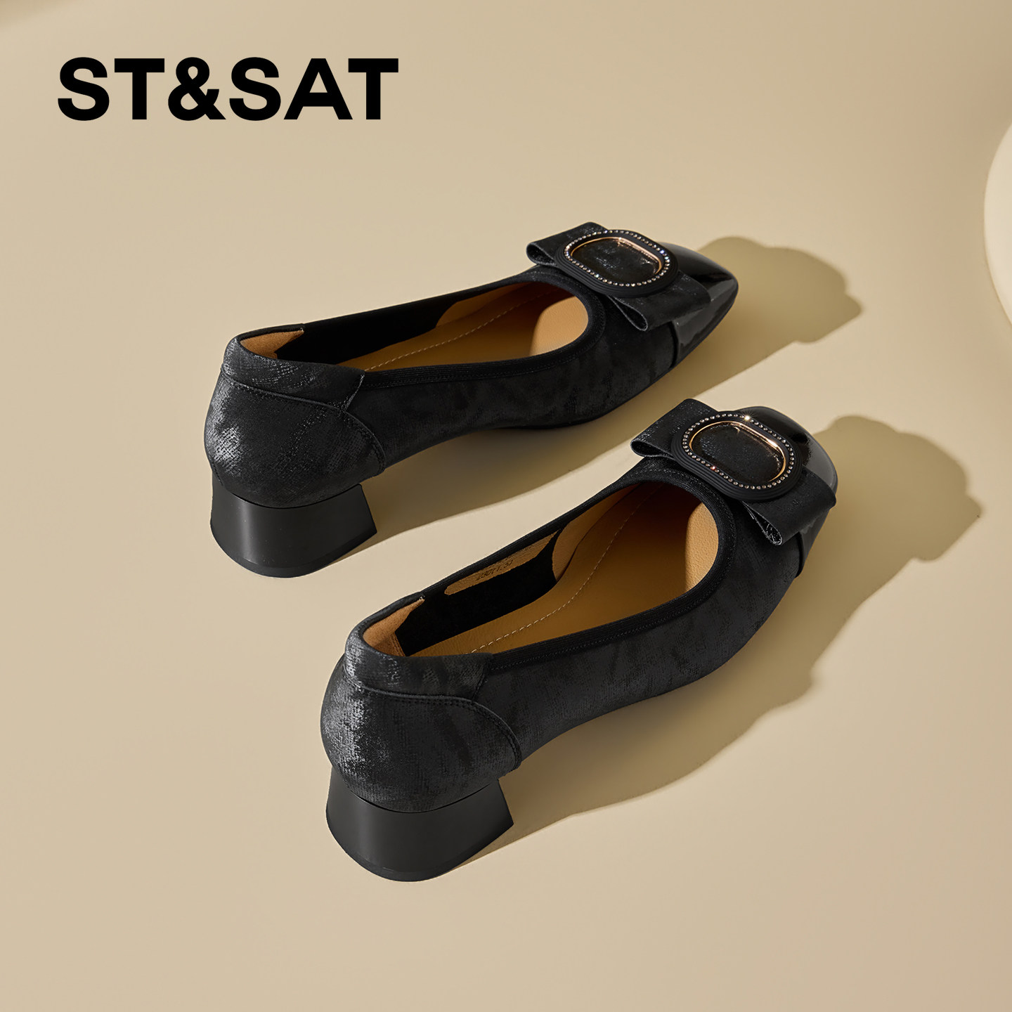 星期六国风真皮方头拼接中跟浅口单鞋女2026春季新款粗跟休闲女鞋