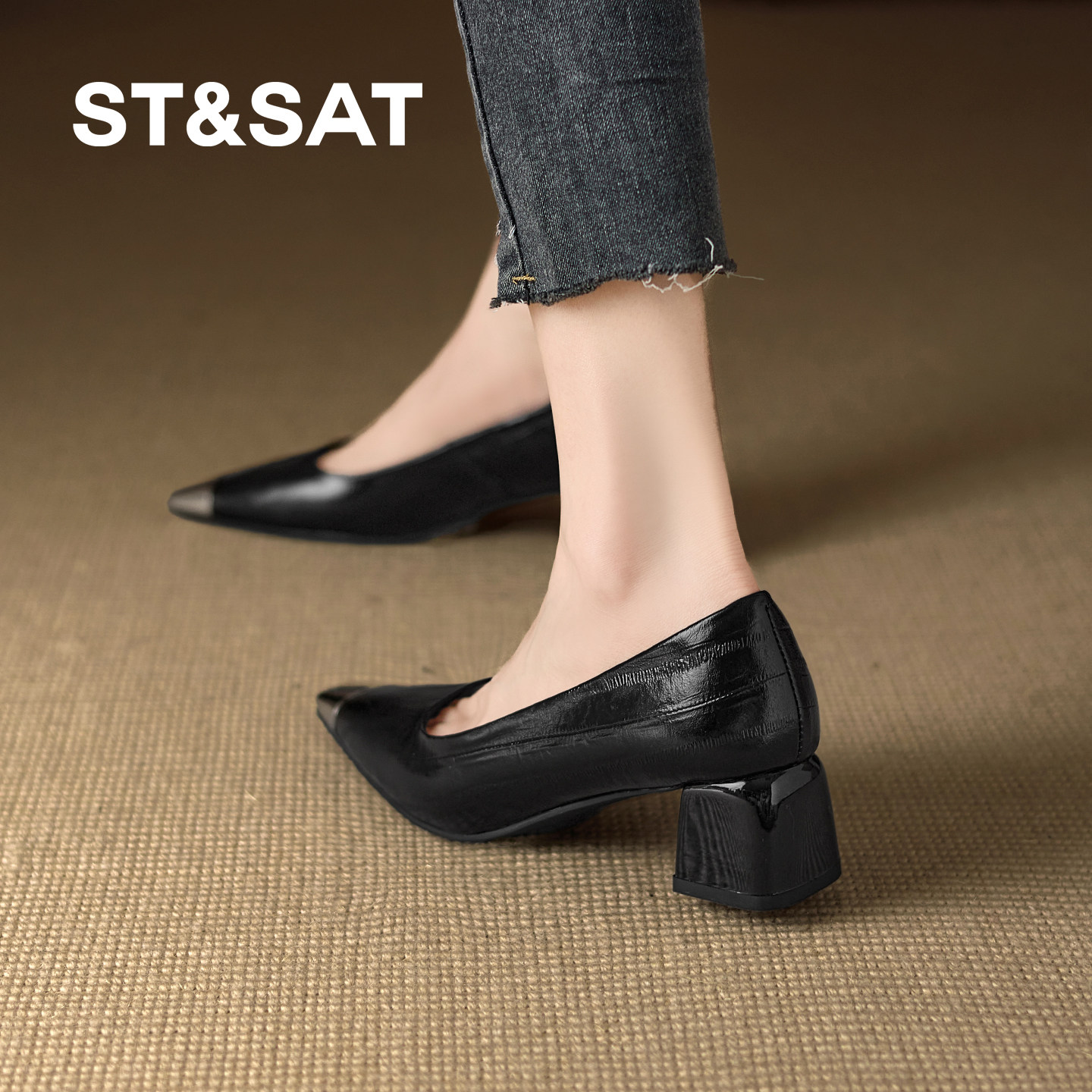 星期六方头粗跟浅口单鞋女春季配裙子高级感拼接中跟羊皮舒适女鞋