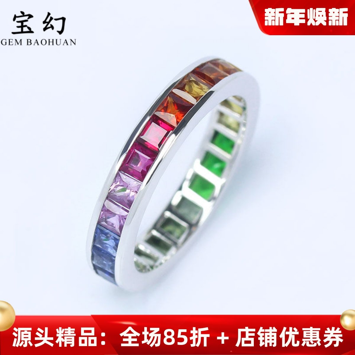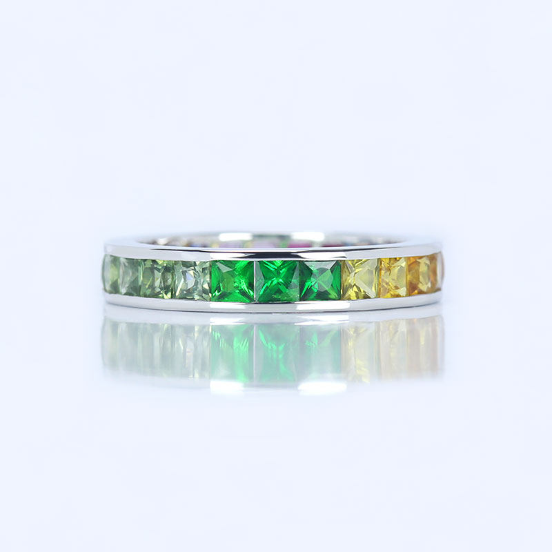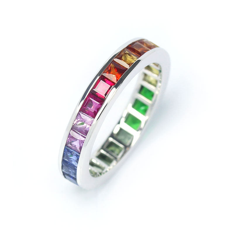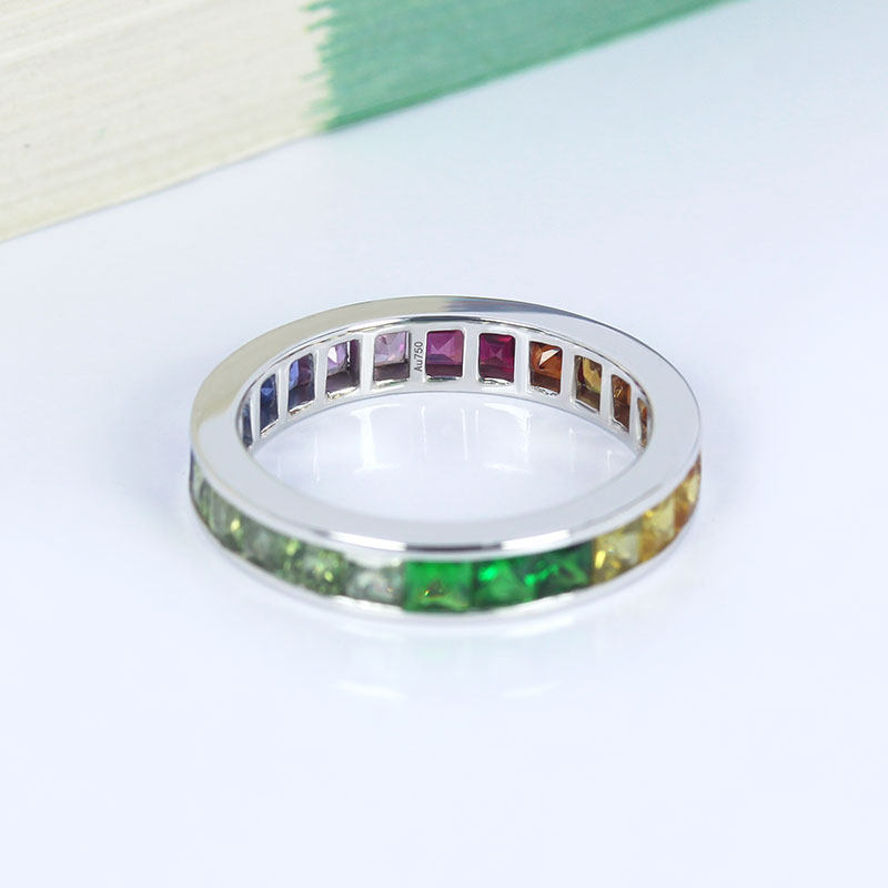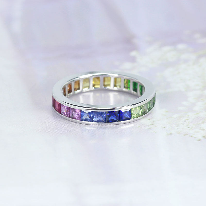 满圈18K白金天然渐变彩虹色蓝宝石排戒 舒适尾戒指环戒指正品女款
