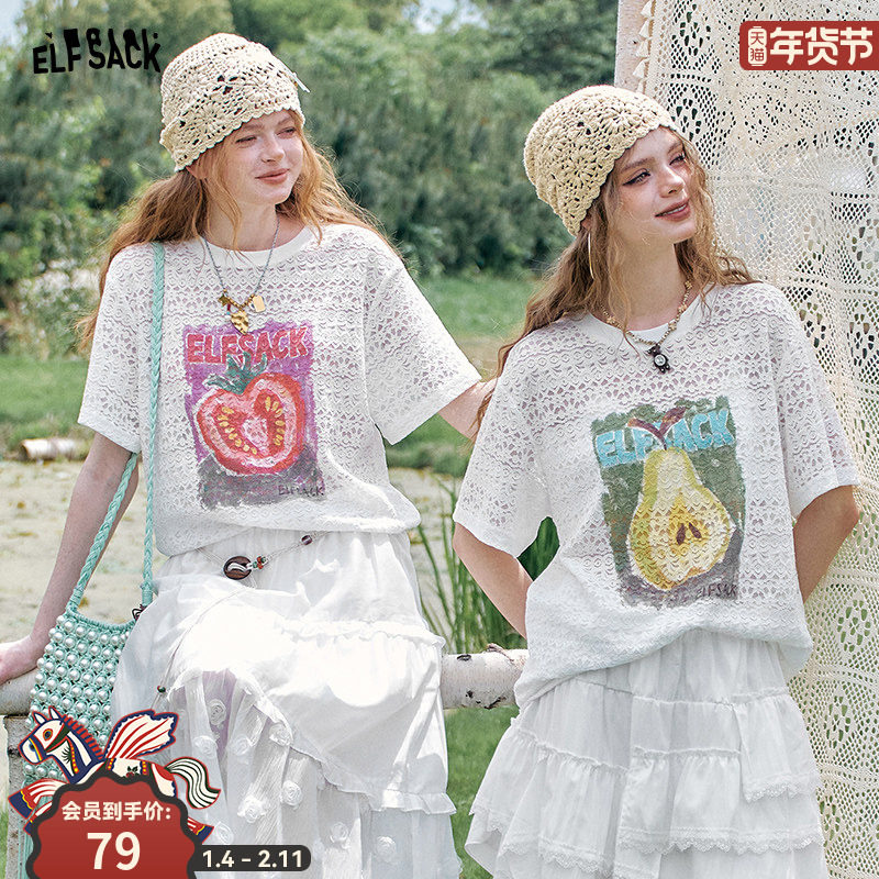 妖精的口袋白色蕾丝印花短袖t恤女2025夏季新款宽松休闲小众上衣