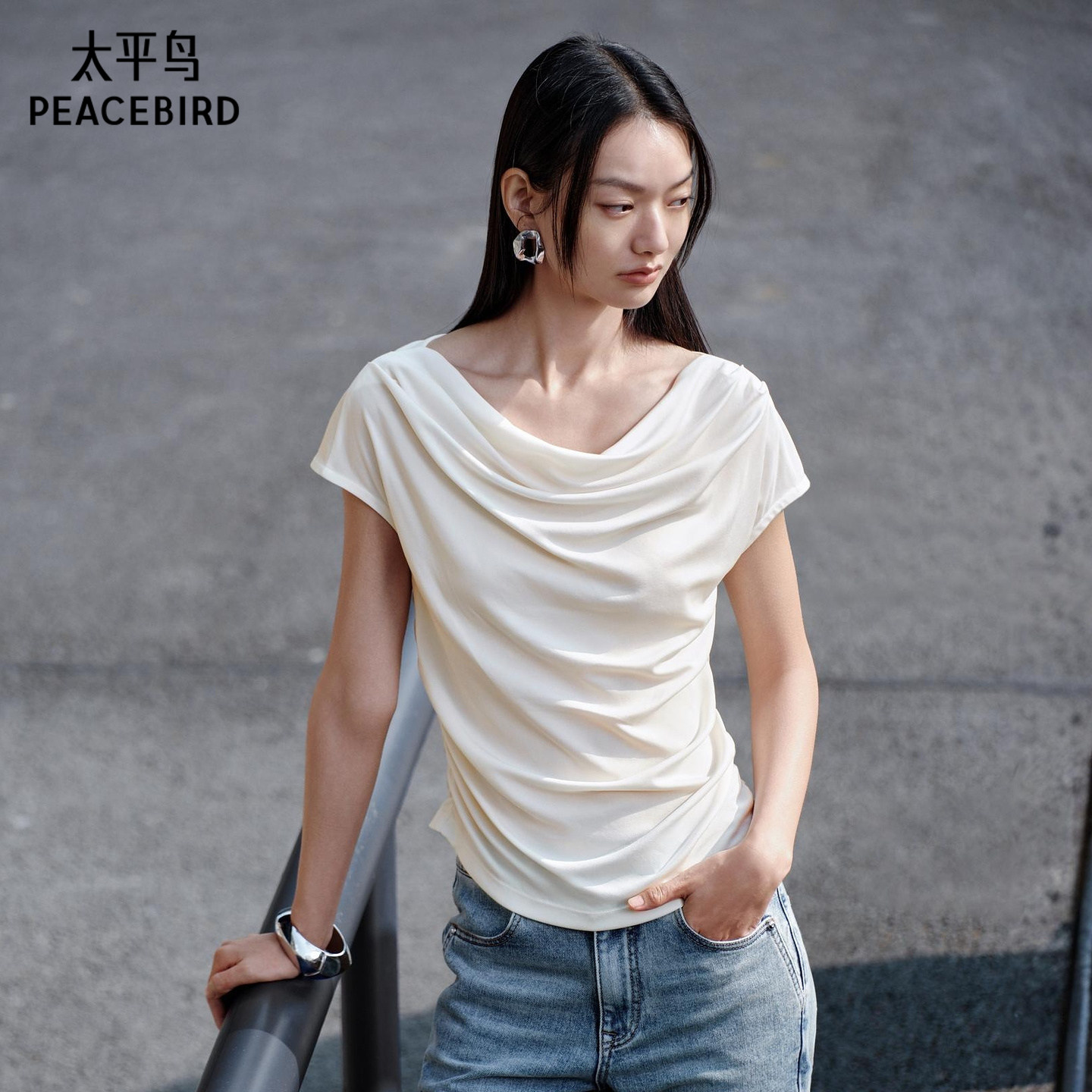 太平鸟荡领三醋酸短袖T恤26夏季新款腰间抽褶显瘦通勤质感上衣女