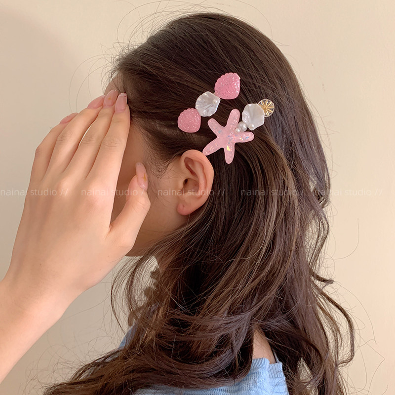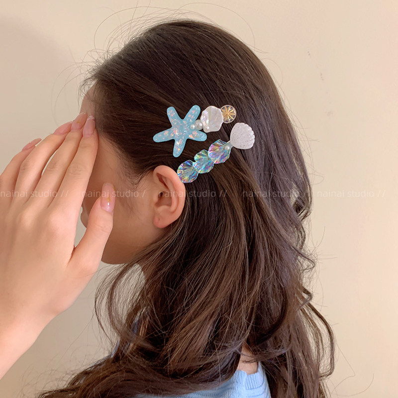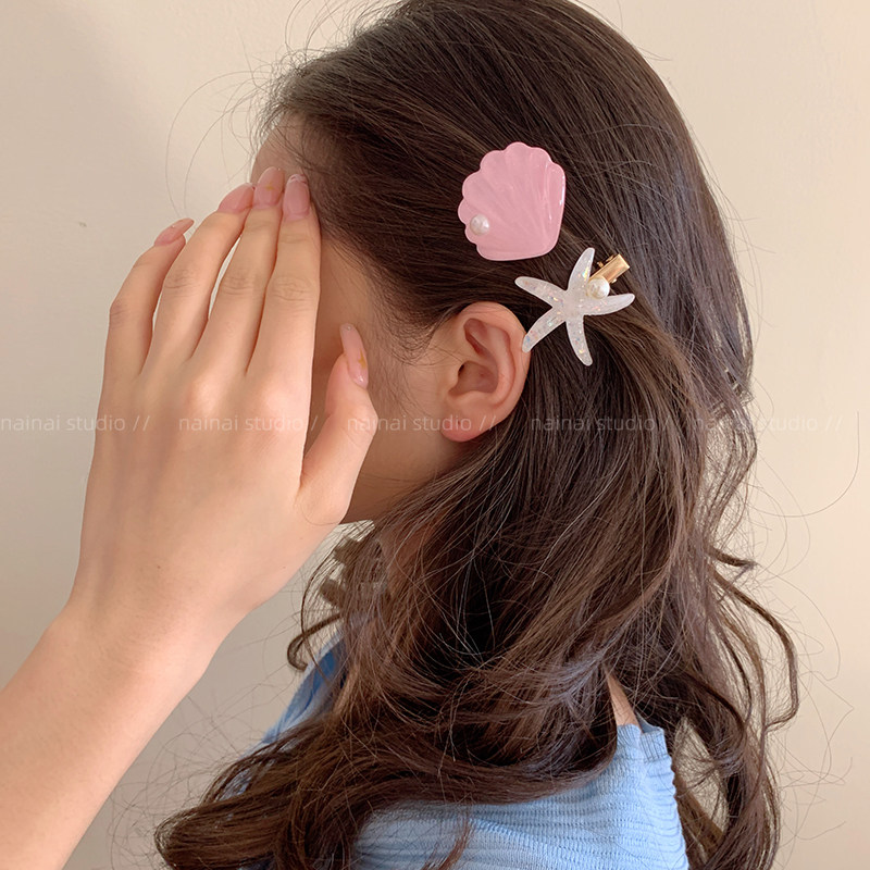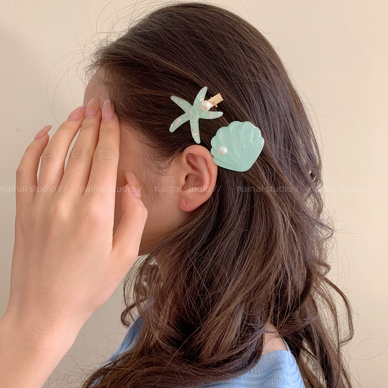 海星贝壳发夹2只装~薄荷绿海边度假风侧边夹凹造型拍照刘海夹发饰
