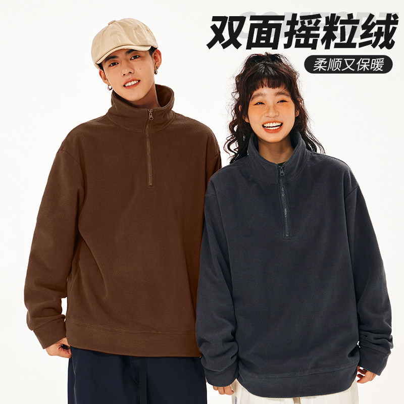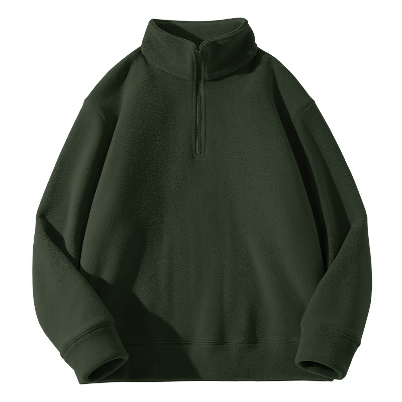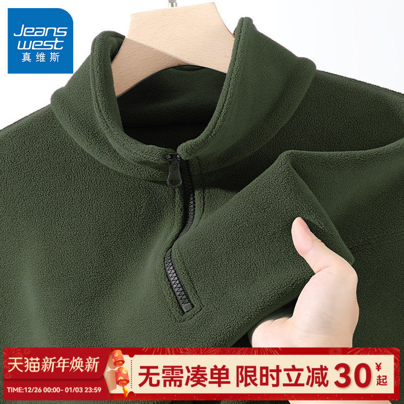 GV真维斯加厚摇粒绒卫衣男冬纯色冲锋衣内胆墨绿翻领半拉链上衣C