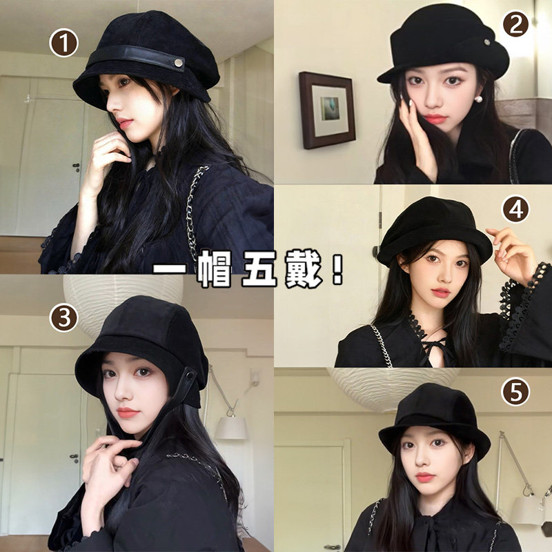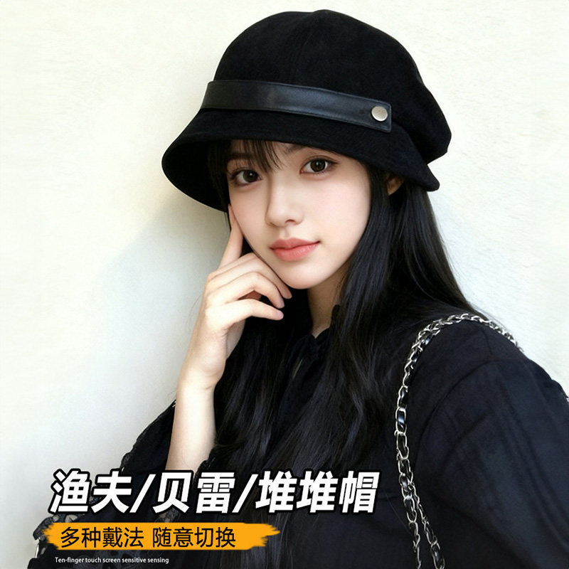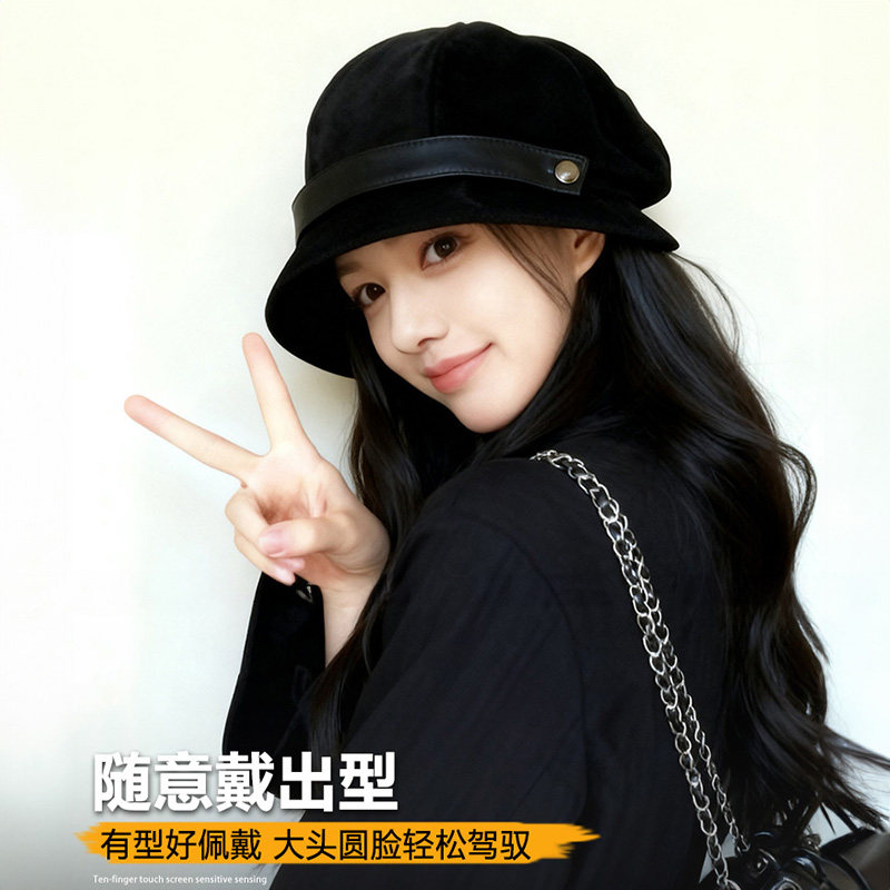 帽子女2025新款秋冬灯芯绒渔夫帽黑色盆帽大头围显脸小贝雷帽圆脸