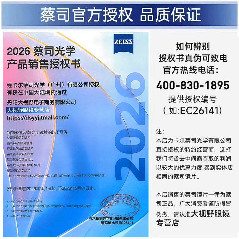 官方正品保证 送镜框 实体店同款 蔡司镜片
