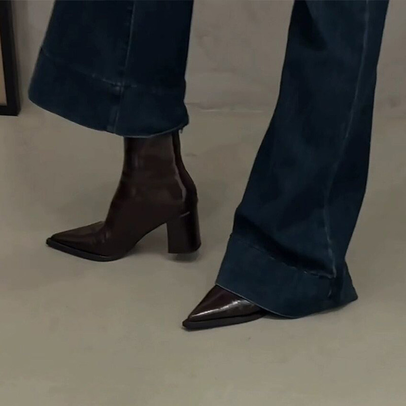 棕色靴子!小个子内增高7CM法式方头靴2025冬新款绒面粗跟短靴女
