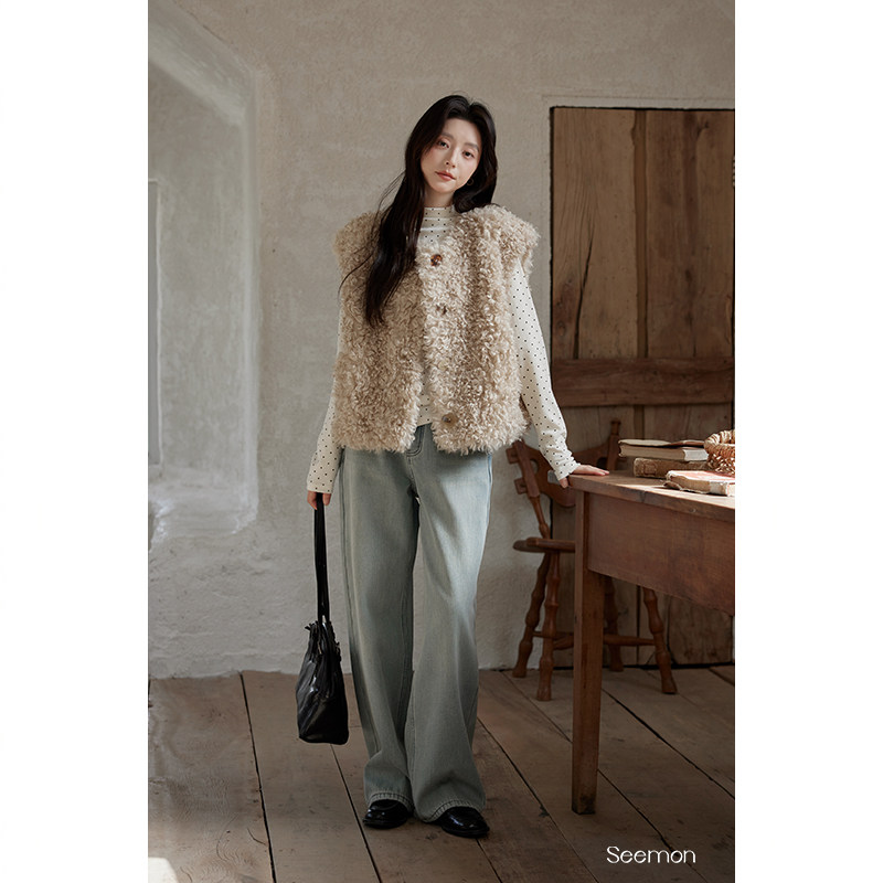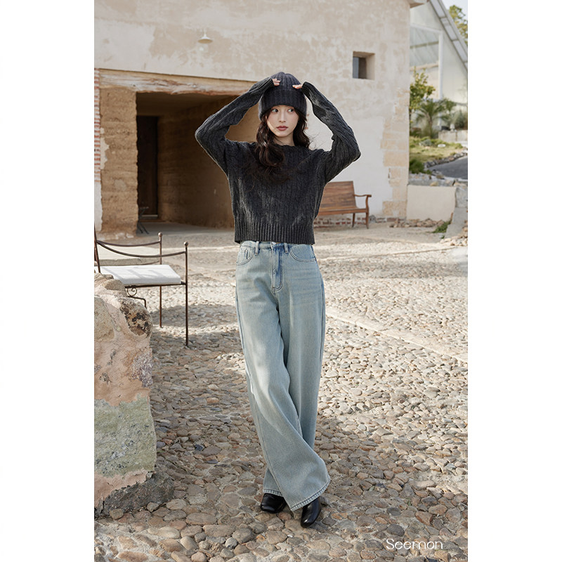 夕蒙2025新款冬季韩系气质裤子宽松阔腿裤小个子浅色加绒牛仔裤女