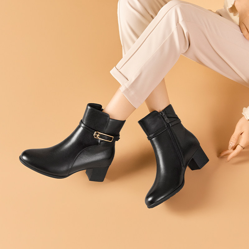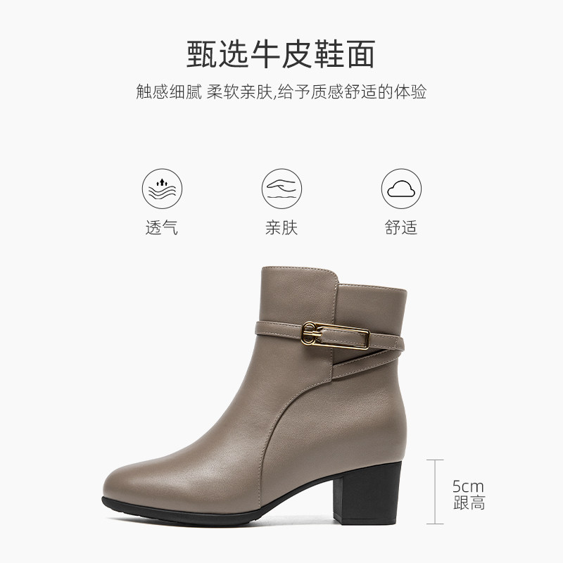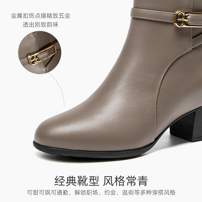 【头层牛皮】粗跟短靴女2025冬新款真皮法式金属扣踝靴百搭时装靴