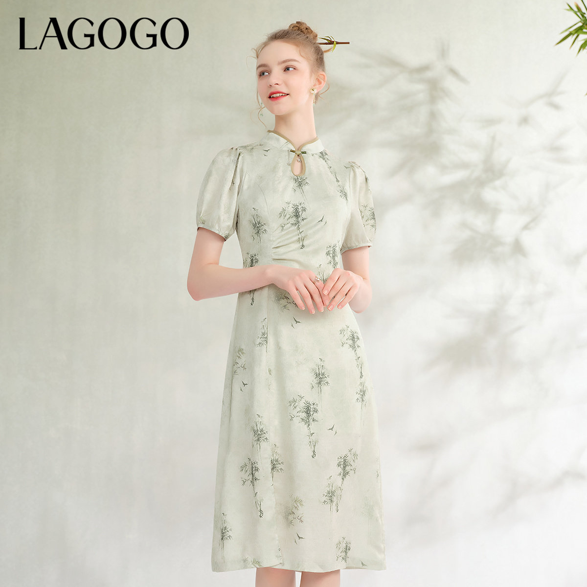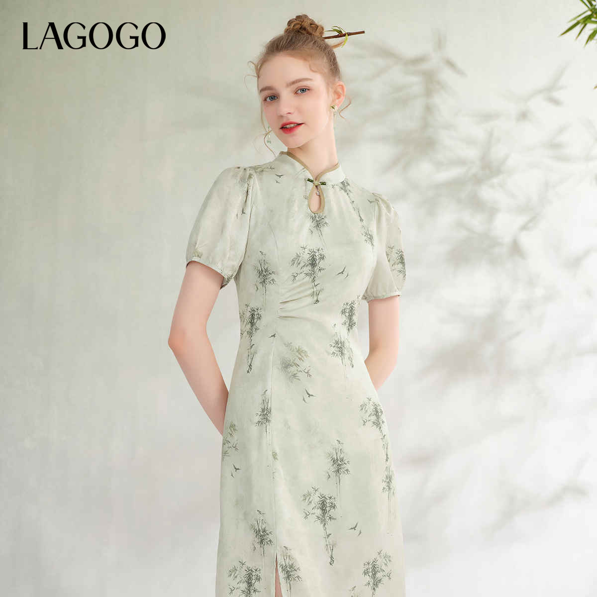 LAGOGO开叉新中式改良旗袍女拉谷谷夏季新款薄荷曼波竹叶连衣裙