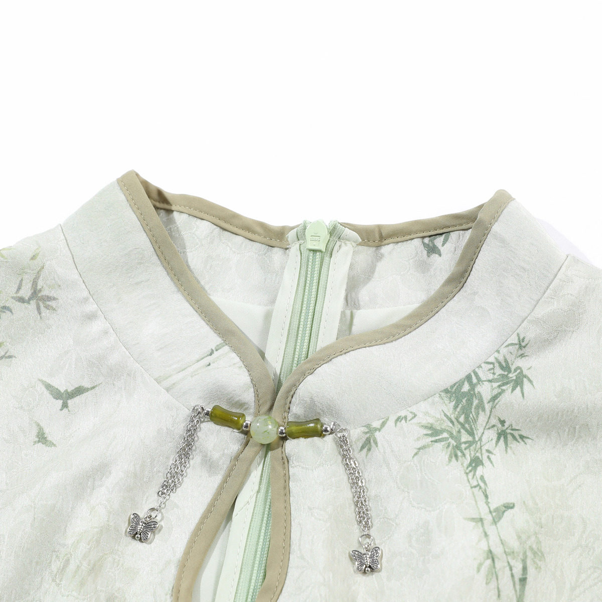 古典立领和中式扣相结合 修身版型 竹叶花型