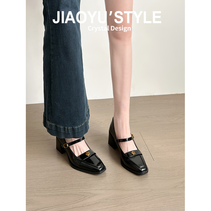 真皮~骄屿方头山茶花玛丽珍鞋女2026新款一字带浅口漆皮粗高跟鞋