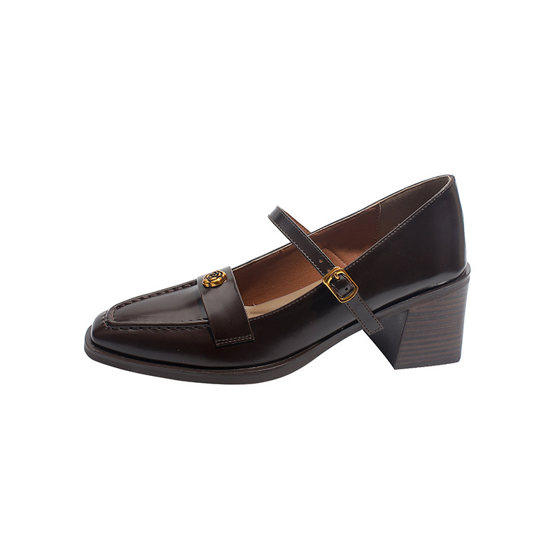 真皮~骄屿复古浅口高跟鞋山茶花一字扣粗跟单鞋尖头气质玛丽珍鞋