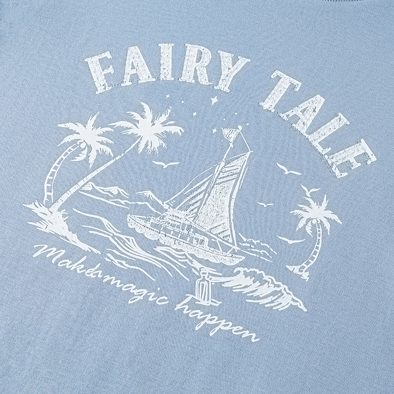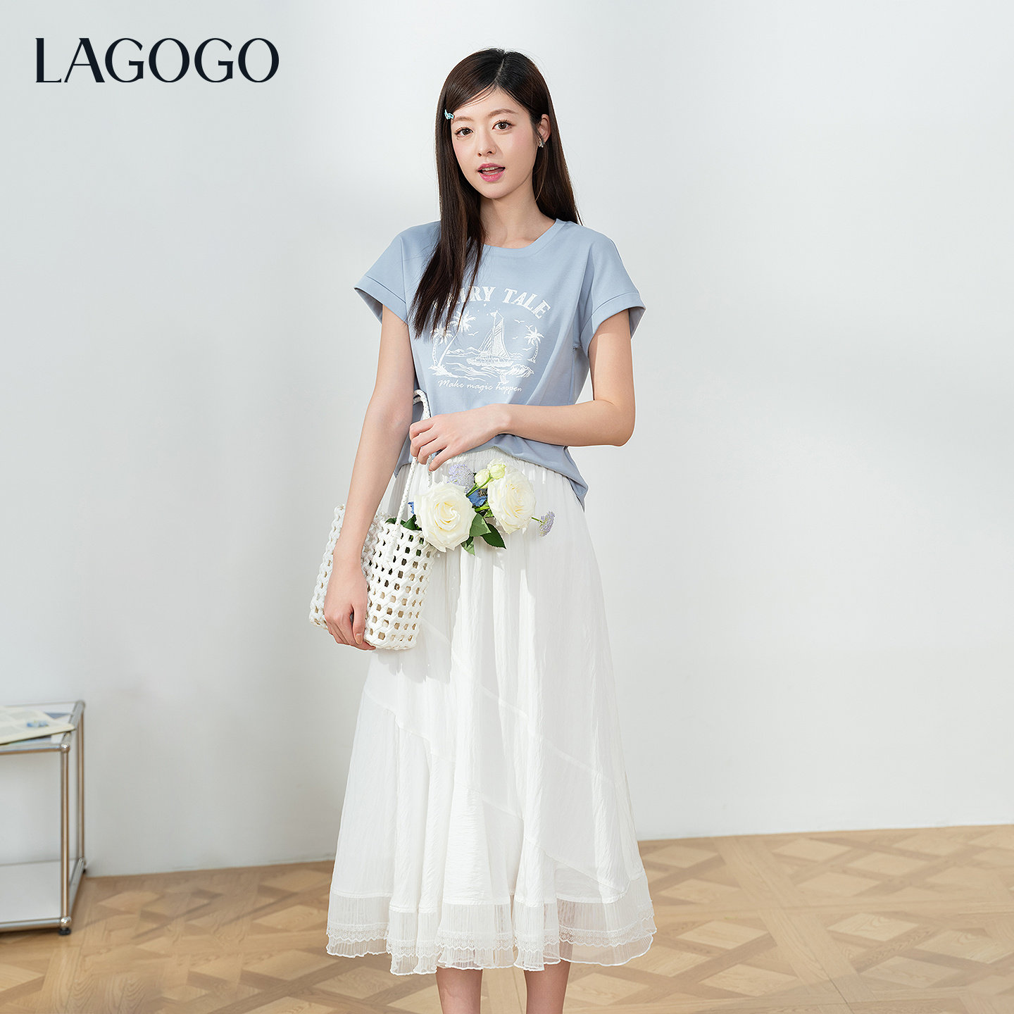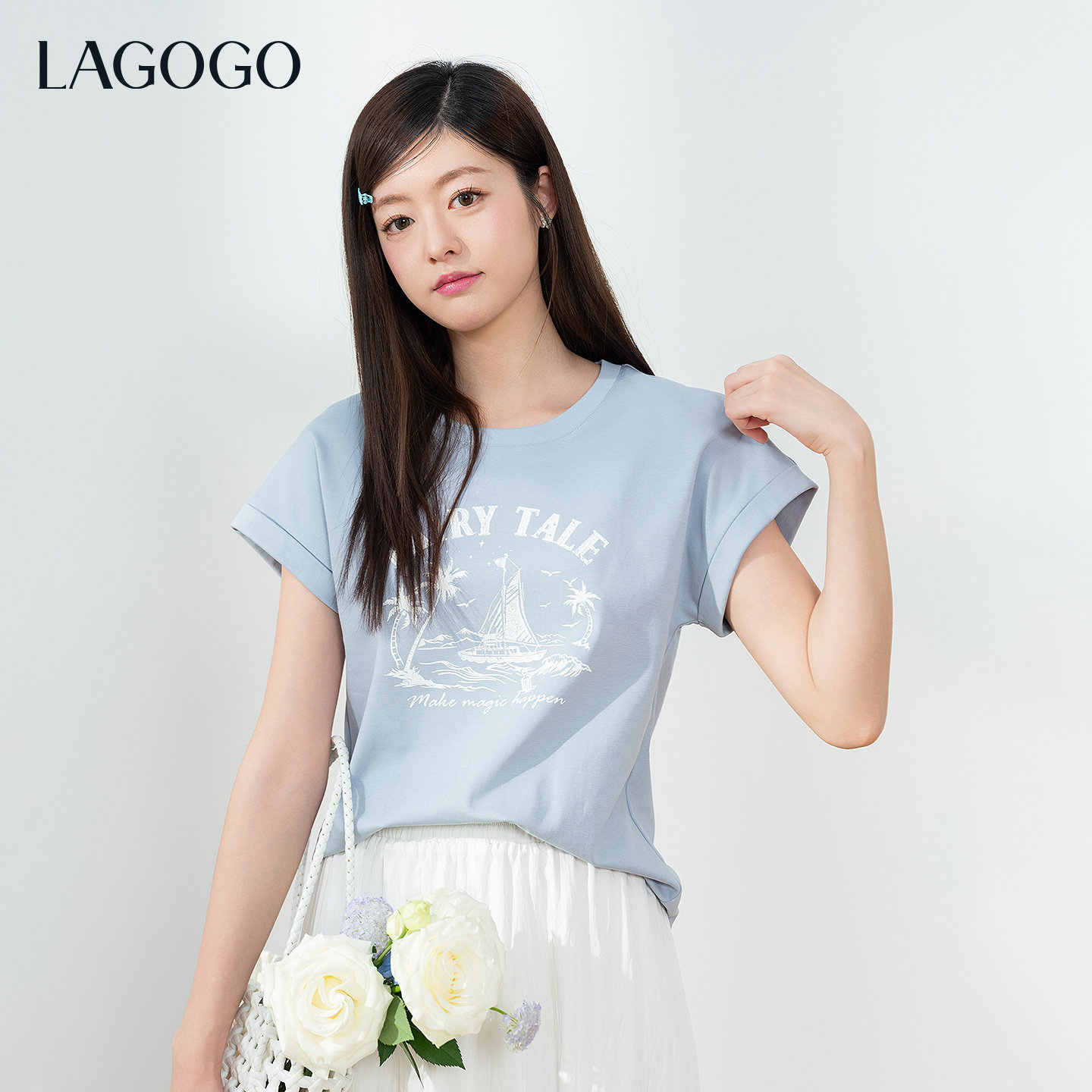 LAGOGO海岛印花纯棉T恤女拉谷谷2026夏新款浅蓝色亮片短袖上衣