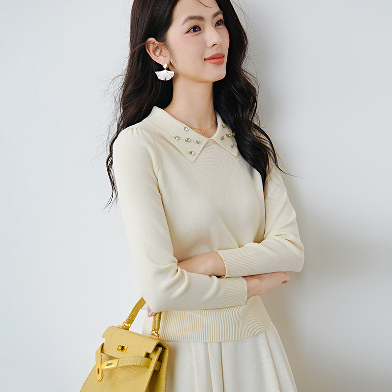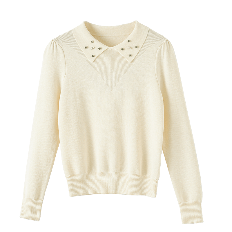晚白2026年春新款优雅甜美泡泡袖上衣钉珠翻领弹力百搭针织衫女