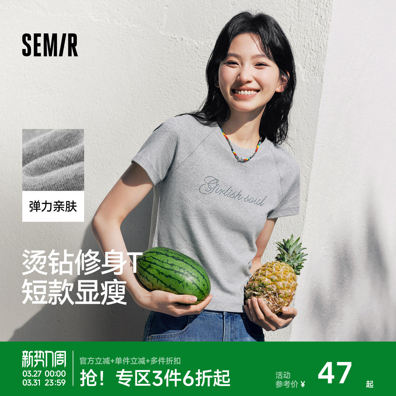 森马短袖T恤女短款字母插肩袖紧身2025夏季新款时尚烫钻衣服气质