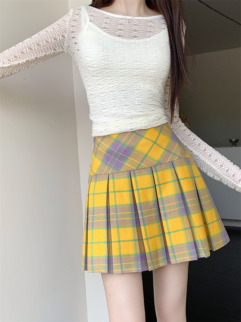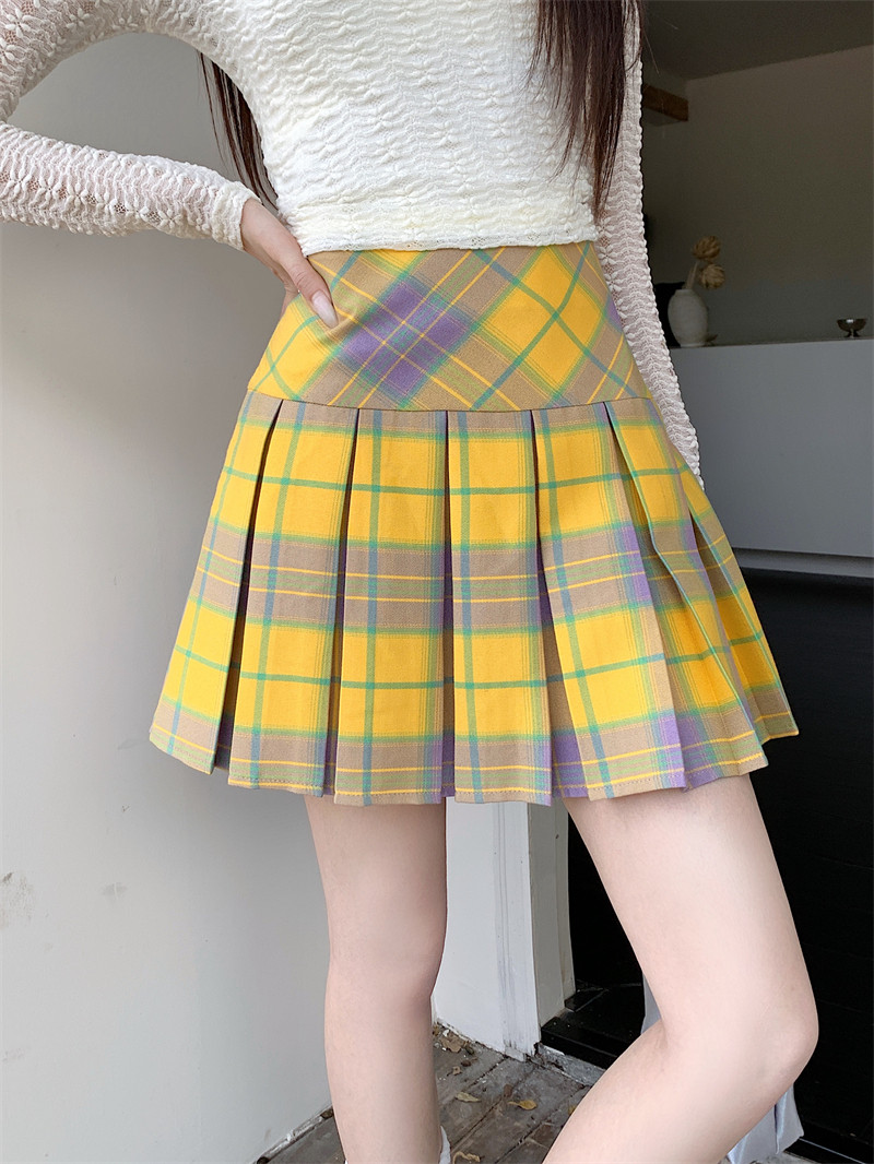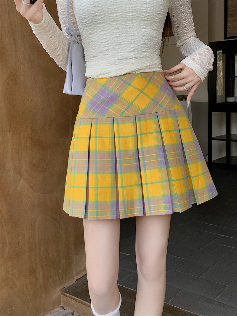 美式复古黄色格子百褶裙夏大码高腰显瘦短裙女格纹A字包臀半身裙