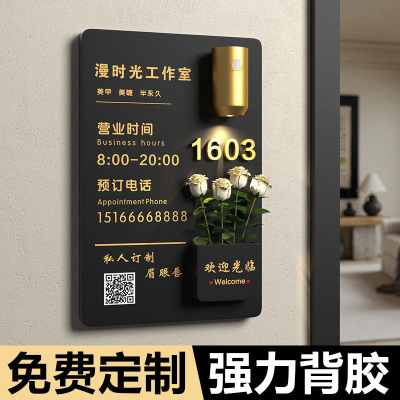 营业时间告示牌玻璃贴工作室logo门牌招牌定制门贴插花感应灯美甲门口头广告牌提示轻奢挂牌美容店工作时间牌