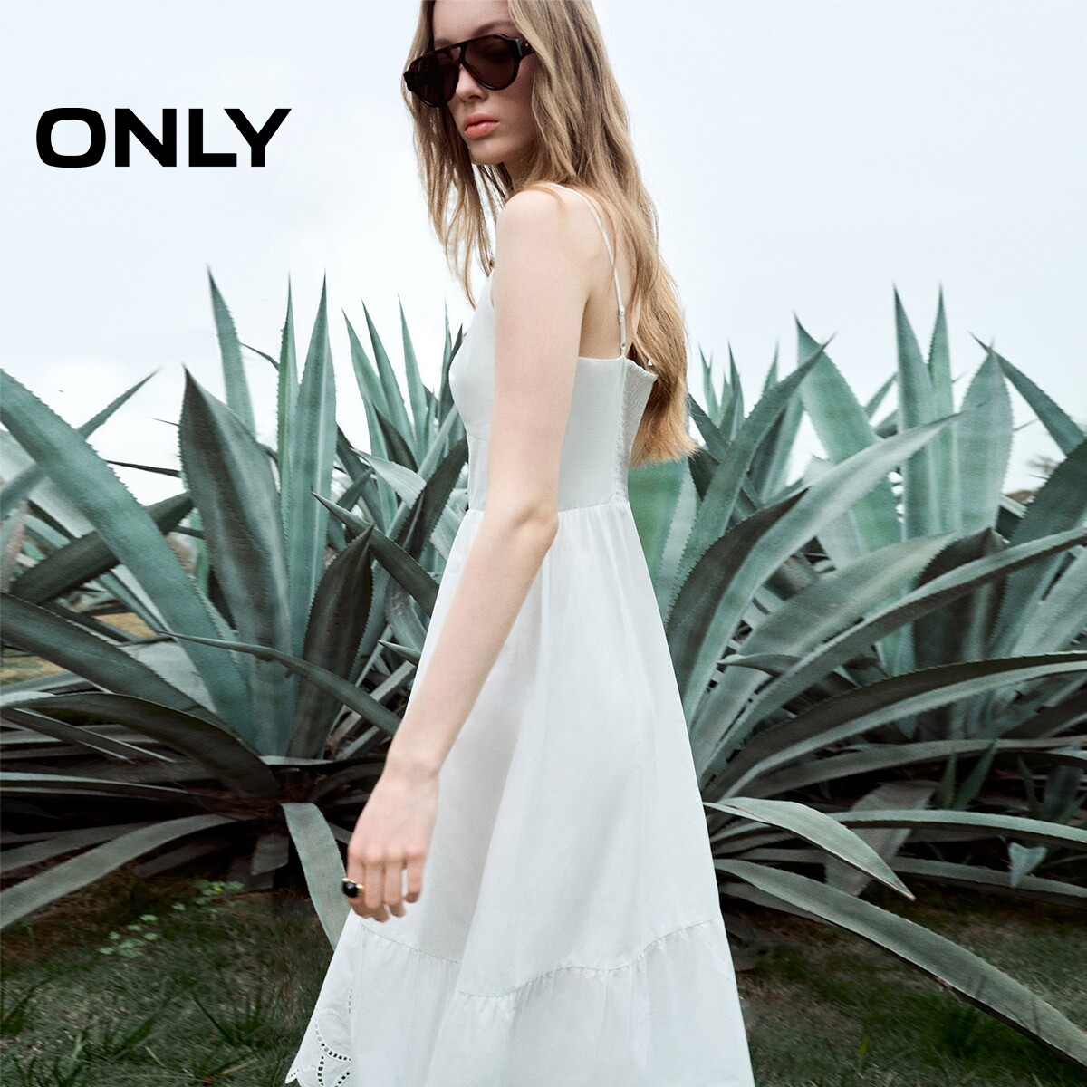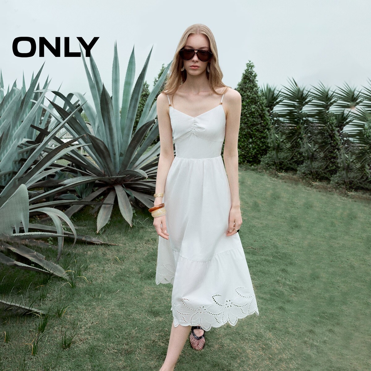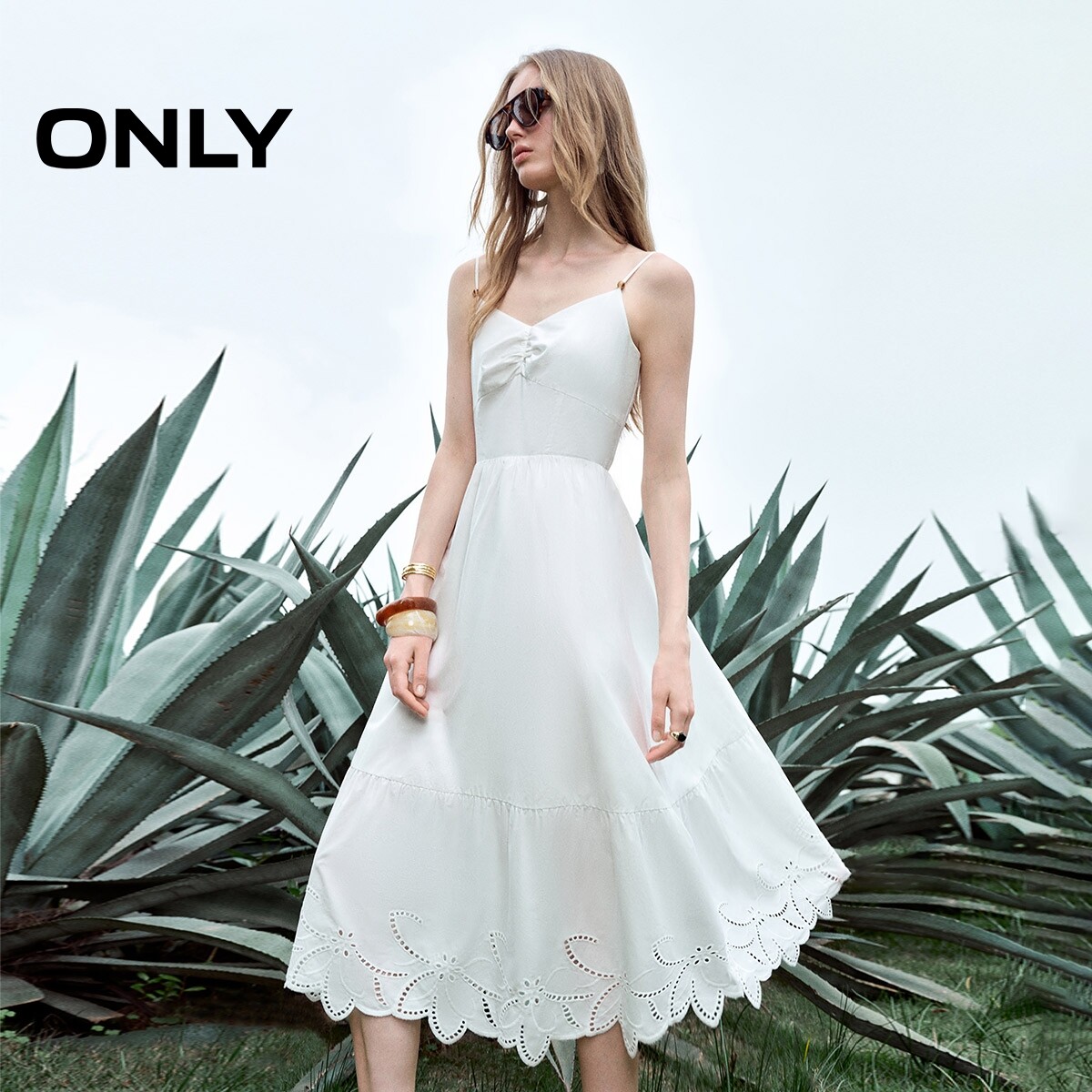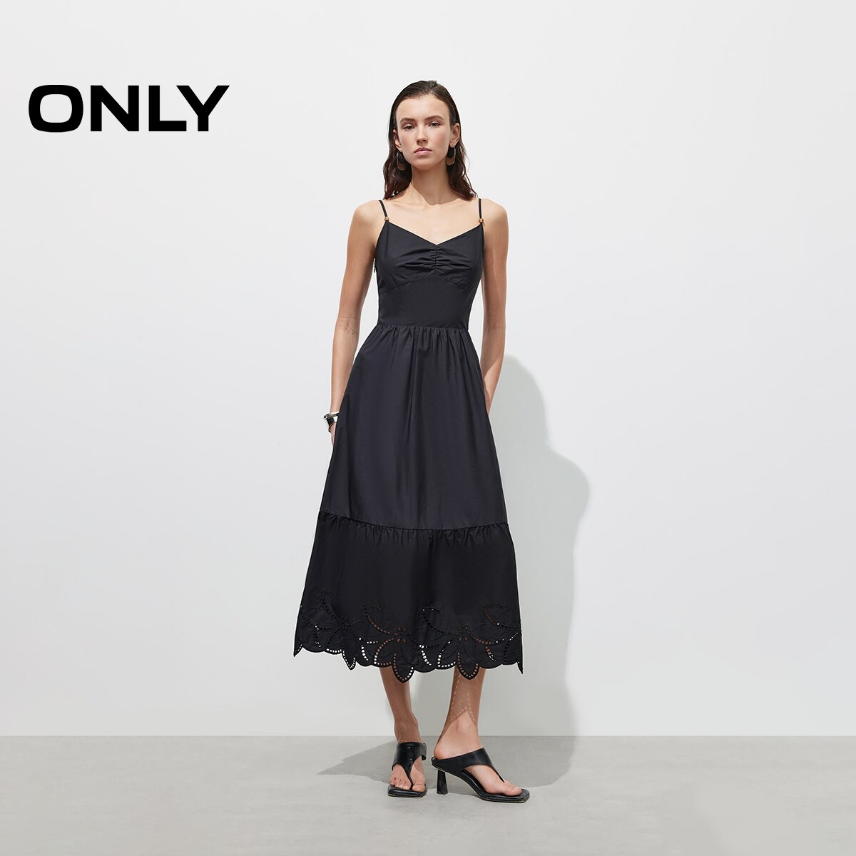 【ONLY奥莱】春季镂空刺绣修身纯色吊带A字收腰伞裙长裙连衣裙女