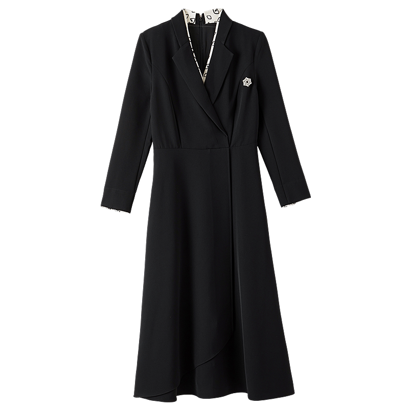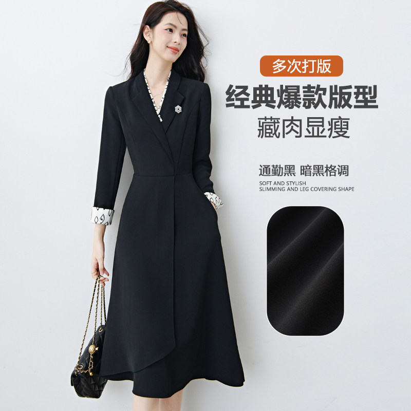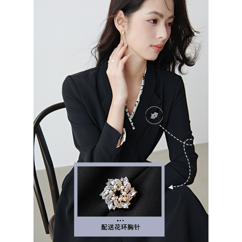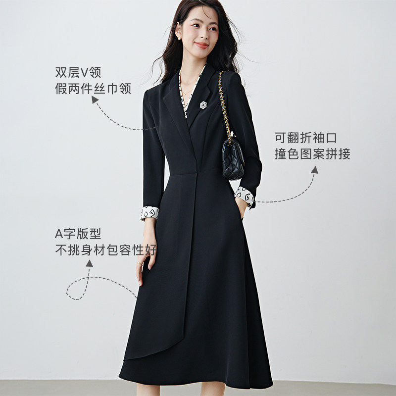 晚白2026年春新款黑白撞色V领假两件小黑裙高智感配胸针连衣裙