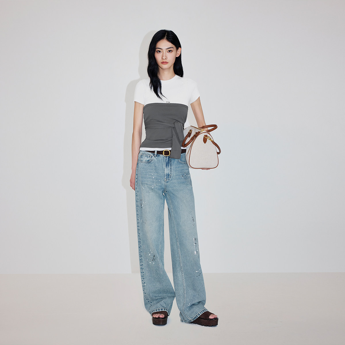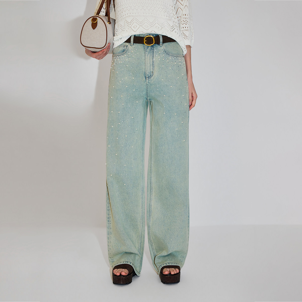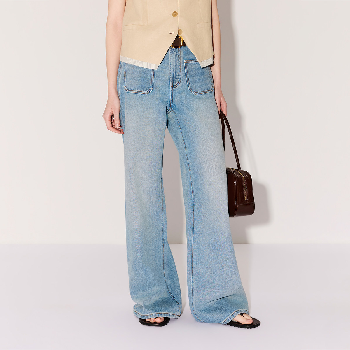 twosweet【超级裤神】四面弹重塑大长腿高腰直筒微喇叭原色牛仔裤