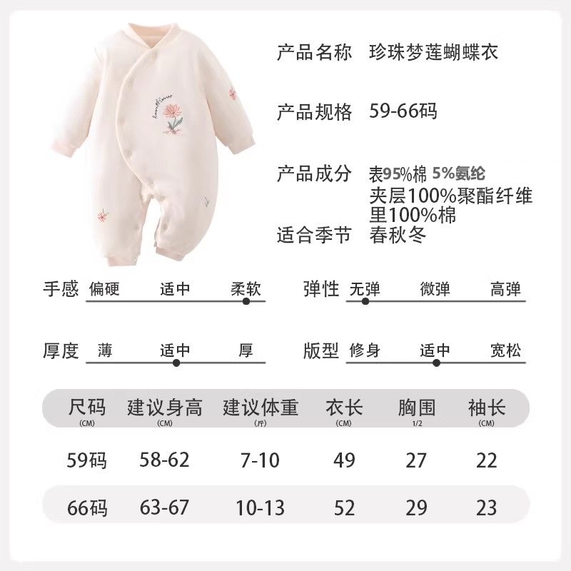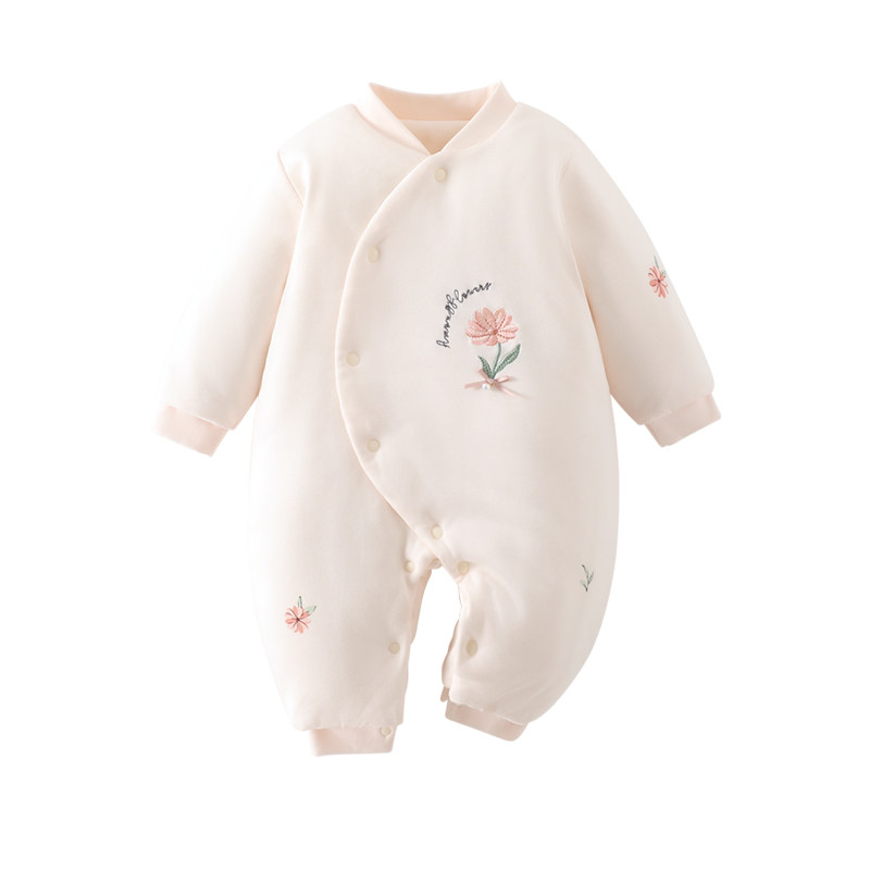 婧麒婴儿连身衣夹棉保暖秋冬加厚花朵刺绣偏襟哈衣冬季可爱爬爬服