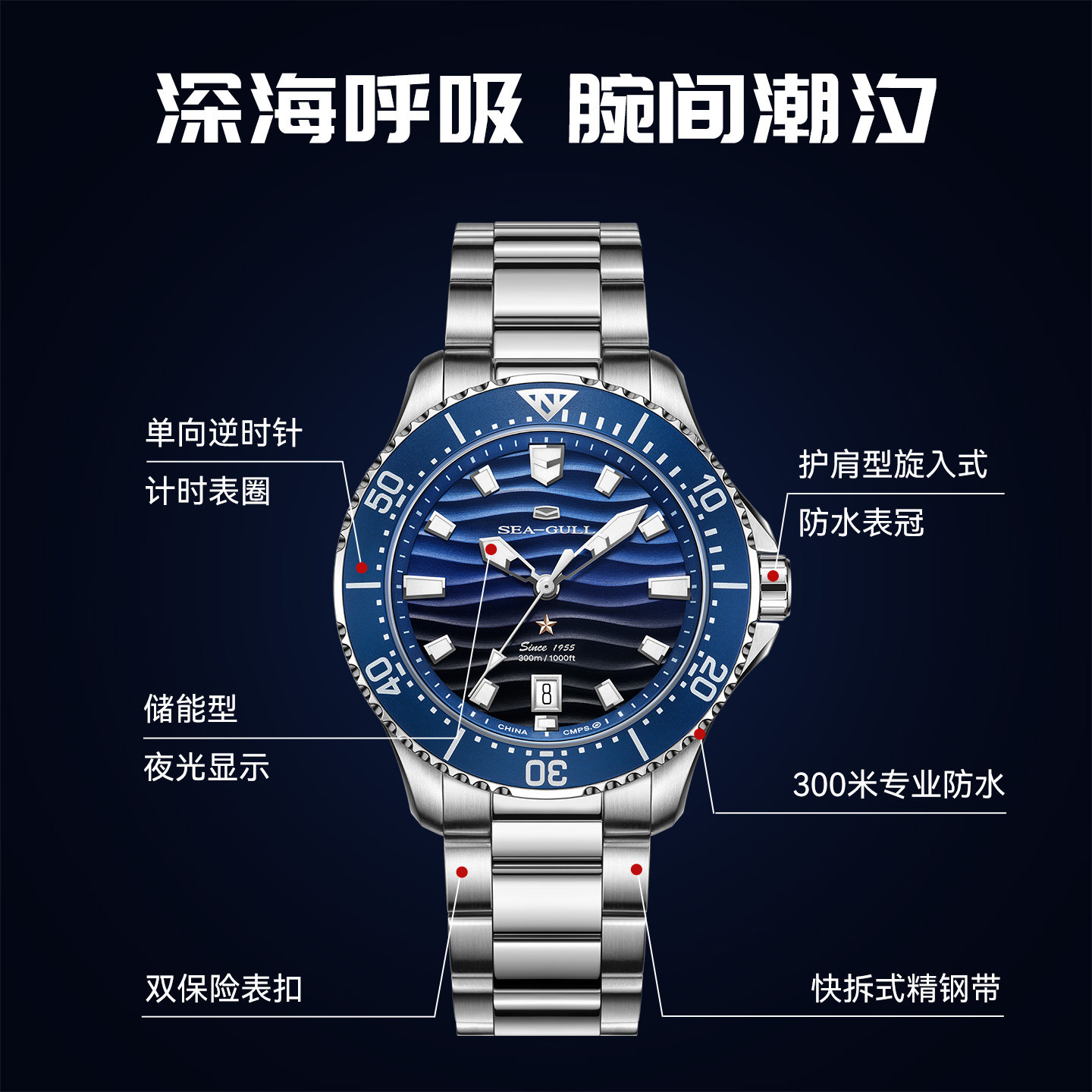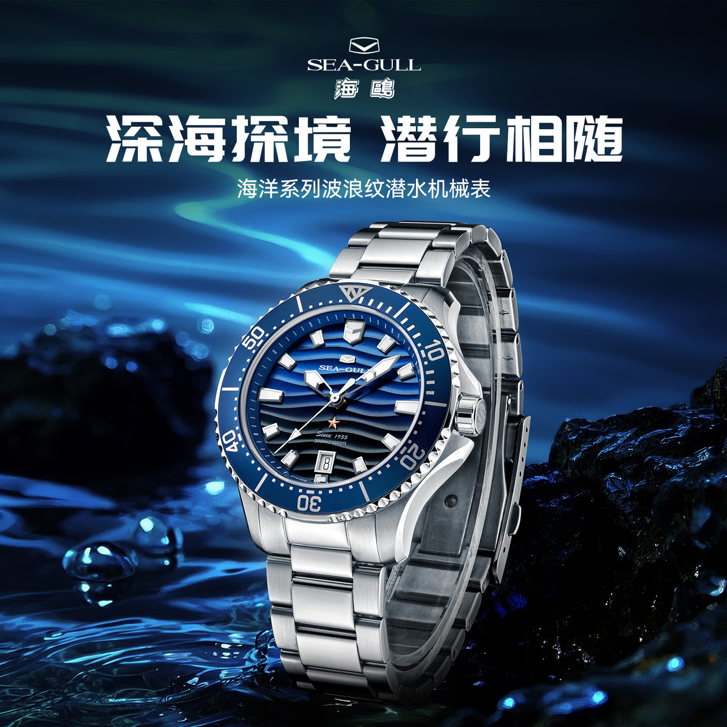 海鸥表手表海洋系列波浪纹潜水机械表夜光运动男士自动机械表1218