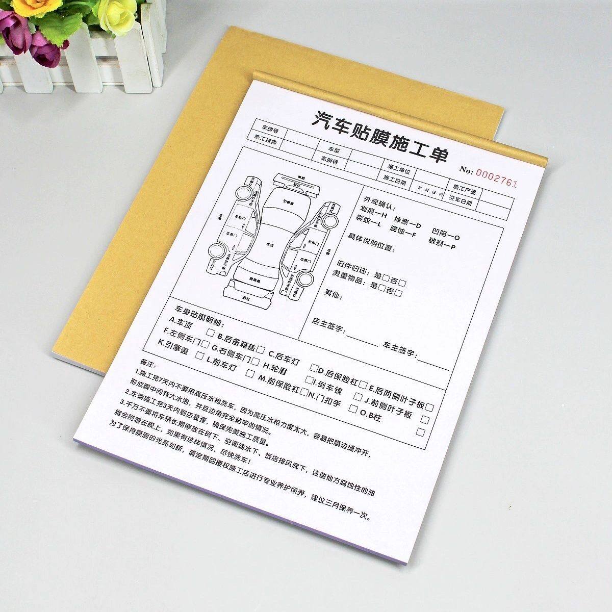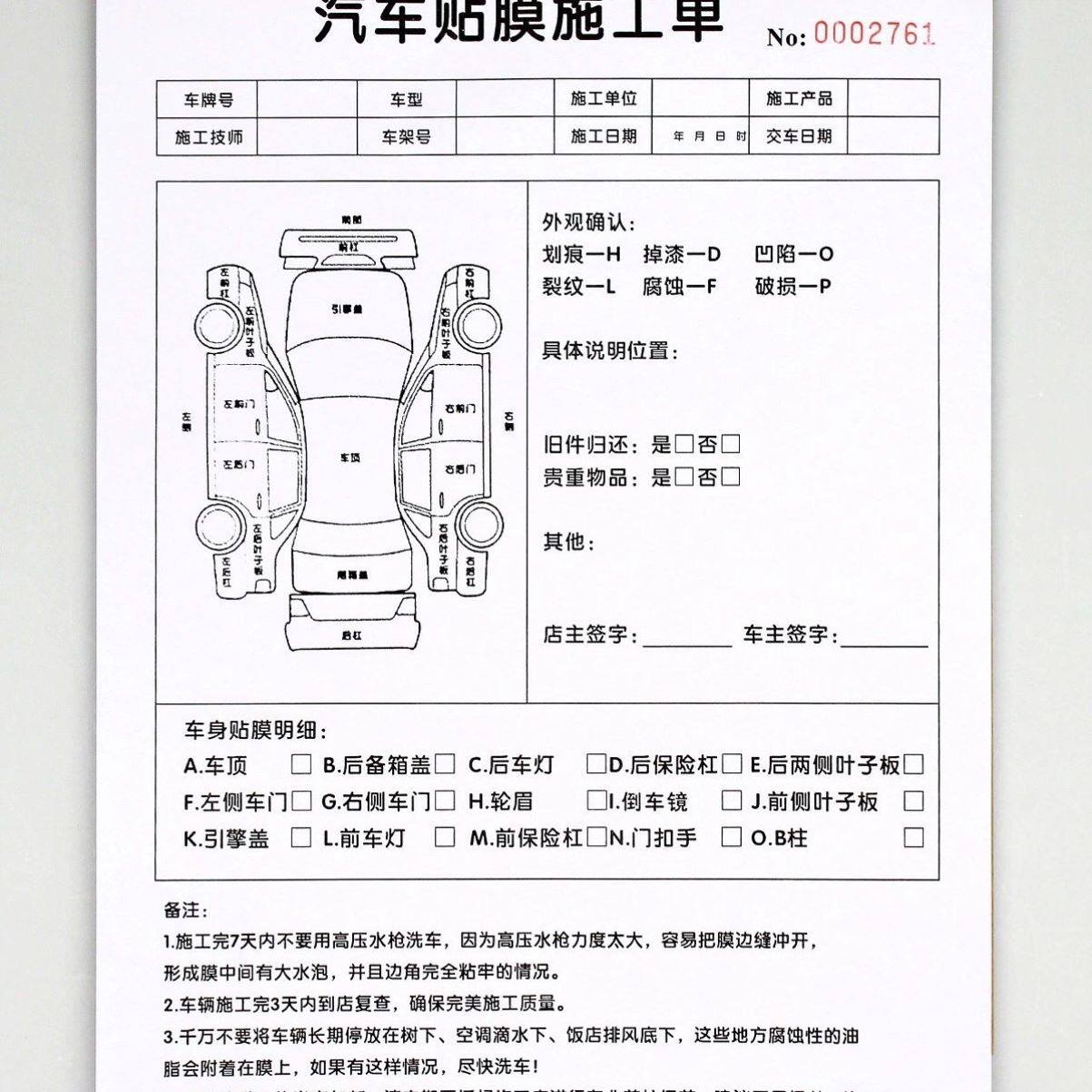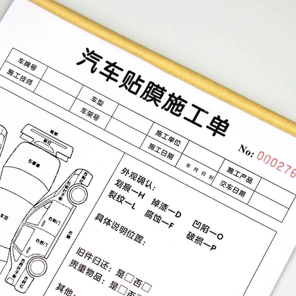 汽车美容贴膜施工单车辆外观检查验车表二联车膜贴车衣接车单定制