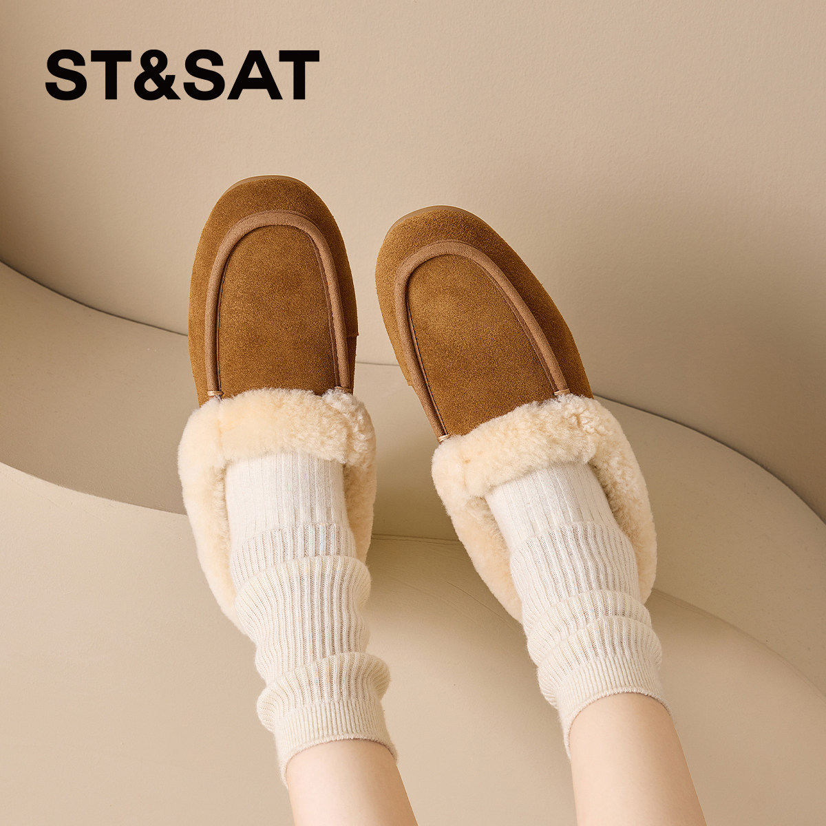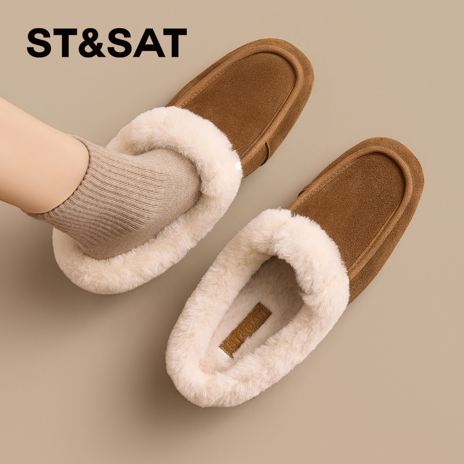 星期六加绒毛毛鞋新款春季女鞋勃肯半拖鞋一脚蹬平底豆豆鞋直