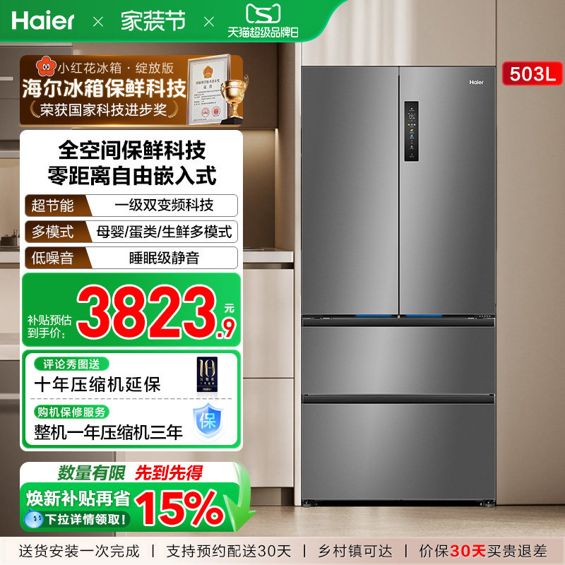 换新补贴海尔小红花503L法式四门一级超薄零嵌入式家用风冷冰箱